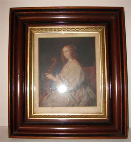 WALNUT SHADOWBOX FRAME WITH PRINT. Print depicts a seated female with cello. 16" x 18" framed