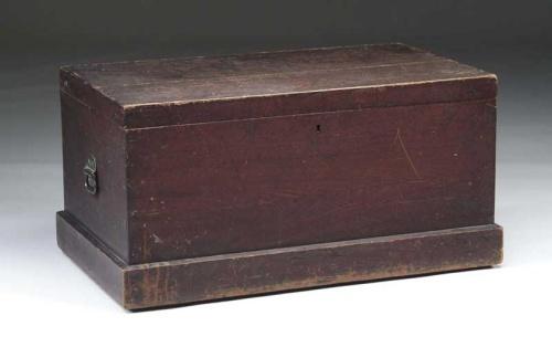 WALNUT STORAGE TRUNK. 19th Century. With original lock present, no key. Applied molded base. The top with black writing “Moore 14 Nile Island Lake George Via Caldwel”. SIZE: 18” h x 35-1/2” w x 20-1/2” d. CONDITION: Original finish, has some stains. Otherwise very good. 9-27472