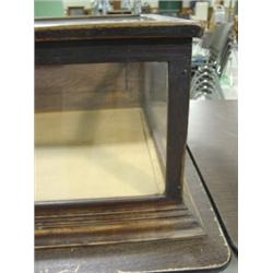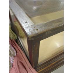 WALNUT TABLE TOP DISPLAY CASE. Two drop down doors in back. Middle section of glass on top is cracked in two places. 15.25" H, 73" W, 25" D
