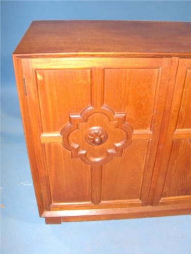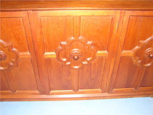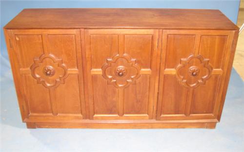 WALNUT THREE DOOR SERVER. Pegged construction. Carved door pulls. Marked with metal tag at back “Mandalay/Don Bosco/Technical School”. 37” H, 60” L, 18” D