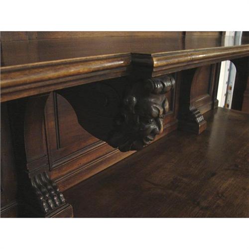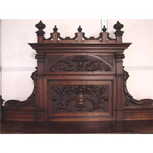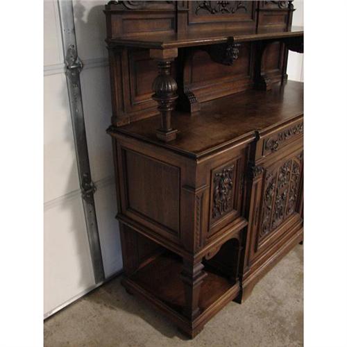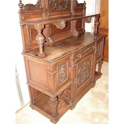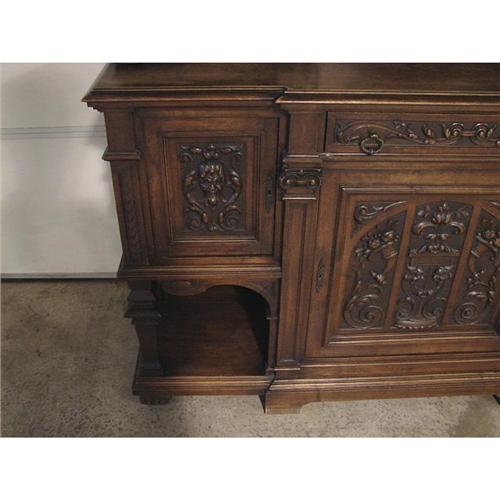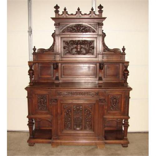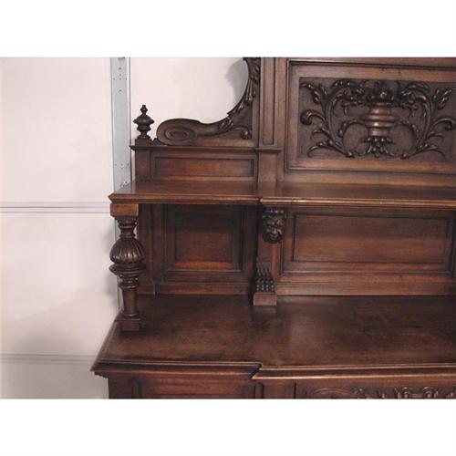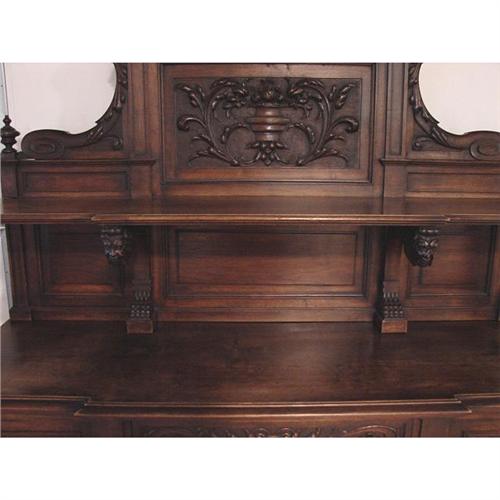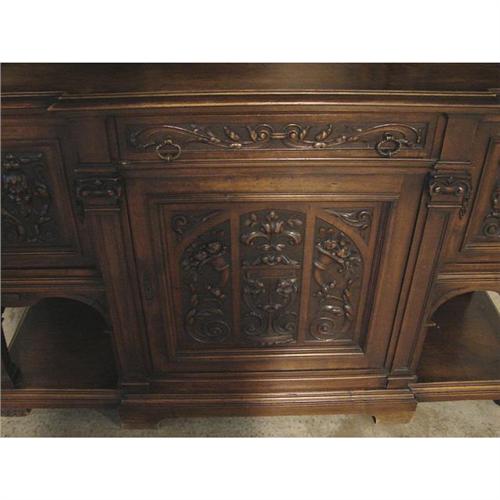 VERY ORNATE WALNUT VICTORIAN TWO PIECE SIDEBOARD. Top section is decorated with swans and urn. Middle section of top is decoration with urn and northwind figures with figure head and claw shelf supports for a single shelf. Bottom section has center drawer with leaf carving above a single door with urn and horn-o-plenty carvings and doors at each side with northwind head carvings over single shelves. 91” H, 64.5” L, 21.5” D