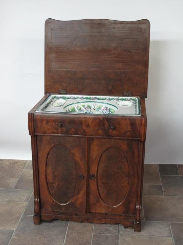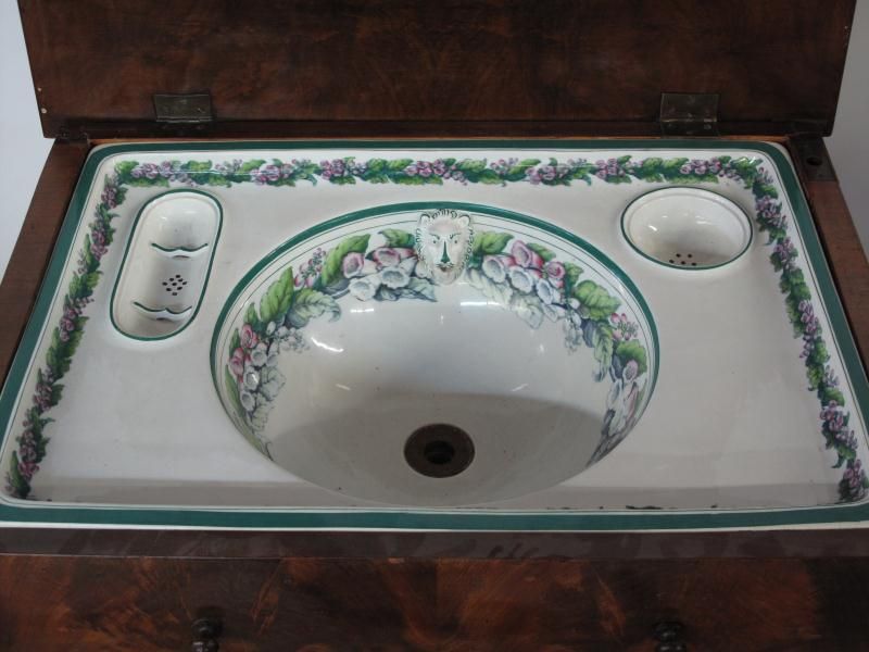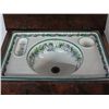 -lift top featuring a porcelain sink with a floral pattern.