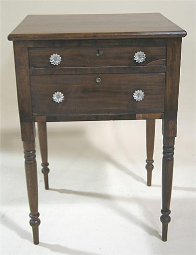 WALNUT TWO DRAWER WORK TABLE. Pencil post legs. Two graduated drawers with sandwich glass knobs. Drawers are dovetailed. Top drawer is divided with compartments. Loss to veneer at areas of front. 30” H, 20.5” W, 17” D