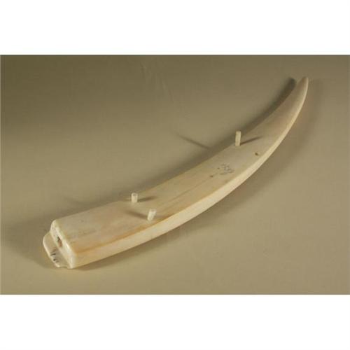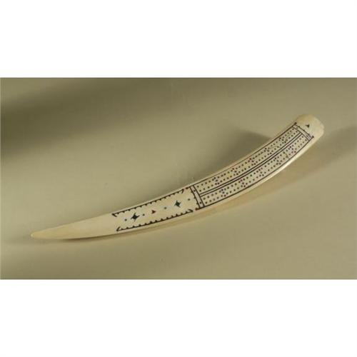 IVORY: Cribbage board made from Walrus tusk ivory, drilled holes, colored divisions, peg legs, pre-drilled storage hole for pegs, tapered 17'',one leg pen missing as are pegs and stopper.