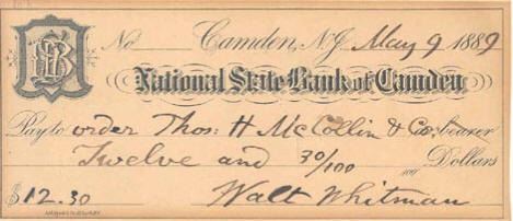 Pre-eminent 19th century American poet. Impressive National State Bank of Camden cheque signed "Walt Whitman", 6.5x3, May 9 1889 entirely engrossed in his hand to "Order Thos. H McCollin & Co [for] Twelve and 30/100",