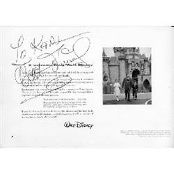 <b>419. WALTER E. DISNEY </b>(1901 - 1966) American artist, film producer and businessman, creator of Mickey Mouse and Donald Duck, producer of the first animated film with sound, builder of theme parks in Anaheim and Orlando. Signed paperback book <i>Walt Disney's Guide to Disneyland</i>, 30pp. 11 1/2" x 8", a 1962 heavily-illustrated park guide. The inside front cover bears a printed welcome by Disney, along with a 3 1/4" x 3 3/4" color image of Disney with two children, and he has added across a portion of the text a large, black ink inscription and signature: "<i>To Karl Walt Disney</i>". Covers bear a few trivial water spots and an abrasion, contents and signed page are very good to fine.<b>$1,500-2,000</b>