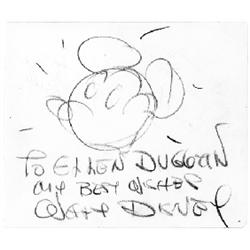 <b>438. WALTER E. DISNEY</b> (1901 - 1966) American artist, film producer and businessman, creator of Mickey Mouse and Donald Duck, producer of the first animated film with sound, builder of theme parks in Anaheim and Orlando. Excessively rare original signed drawing executed in orange indelible pencil upon an album page, 7" x 6", a quick bust sketch of his most famous creation, Mickey Mouse, inscribed and signed at bottom: "<i>To Ellen Duggan My Best Wishes<b> </b>Walt Disney</i>". An unrelated signature on the verso dates Disney's sketch to about October, 1941. Very slight show-through of dark writing on verso disappears when set against a black background, otherwise very good condition.<b> $3,000-4,000</b>
