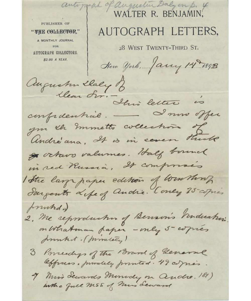 WALTER R. BENJAMIN Newspaper reporter turned autograph dealer, possibly the most influential of the nineteenth-century. A.L.S. on his firm's letterhead, 4pp. 8vo., New York, Jan. 14, 1893, to the American playwright Augustin Daly (and bibliophile). In part: "...This letter is confidential. I now offer you the Emmetts collection of Andreana. It is in seven thick octavo volumes, half bound in red Russian. It comprises [and here Benjamin lists the contents, with additional volumes including autograph material and relics]...In fact the full description would fill pages....If this interests you I should be glad to have you call...I have offered them to no one else...". Light offsetting, very good.