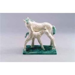 WALTER U. MARCELL GOLDSCHEIDER, Wien Stute mit Fohlen, Keramik. Über rotbraunem Scherben weiße Überlaufglasur mit feinem Craquelée-Netz, partiell mit türkisfarbener Glasurbemalung. Auf rechteckiger Plinthe eine Stute mit Fohlen. Äu. min. best. H.: 13 cm. Bez.: Firmenmarke mit Zusatz Made in Austria (schwarzer Stempel), Mod.Nr. C9, 158 (Prägestempel). 1920er Jahre