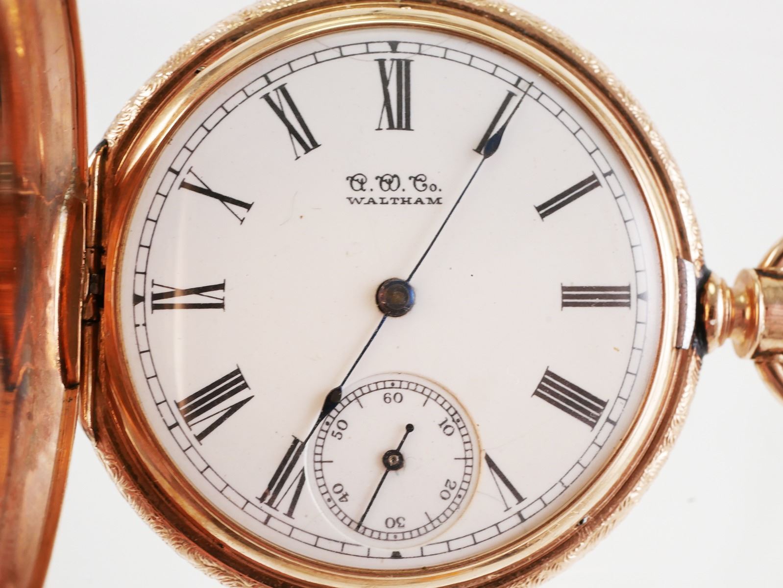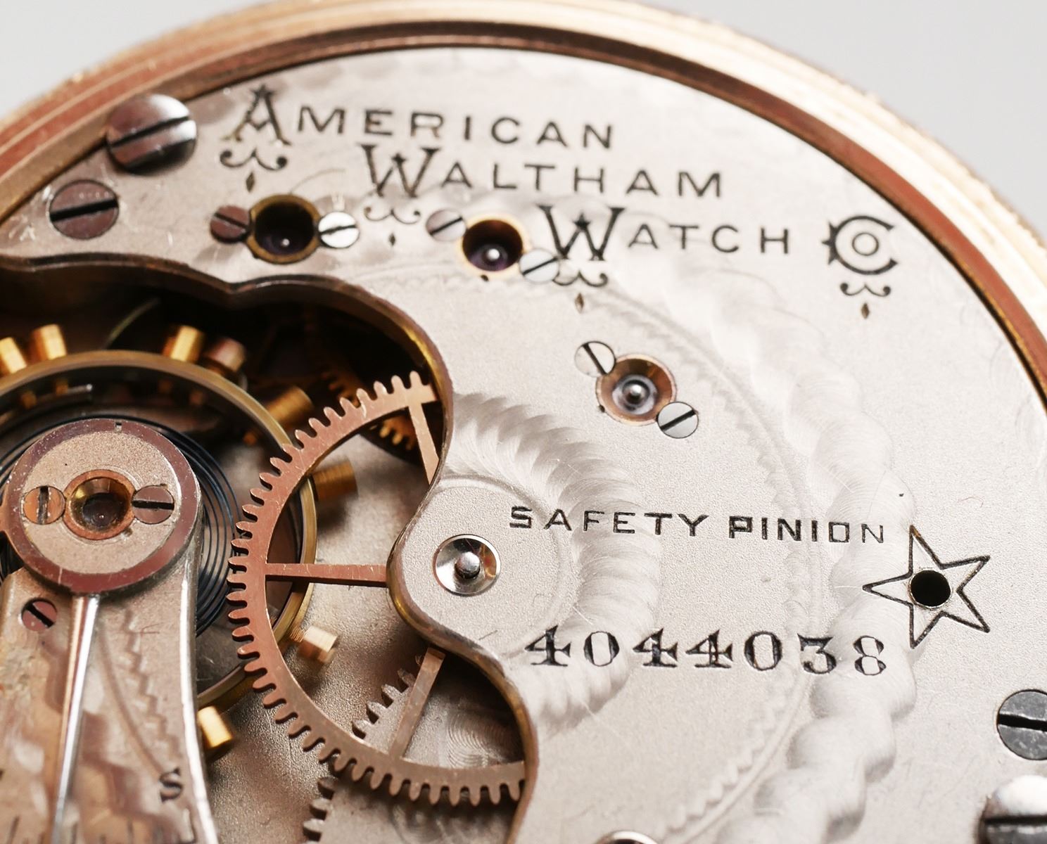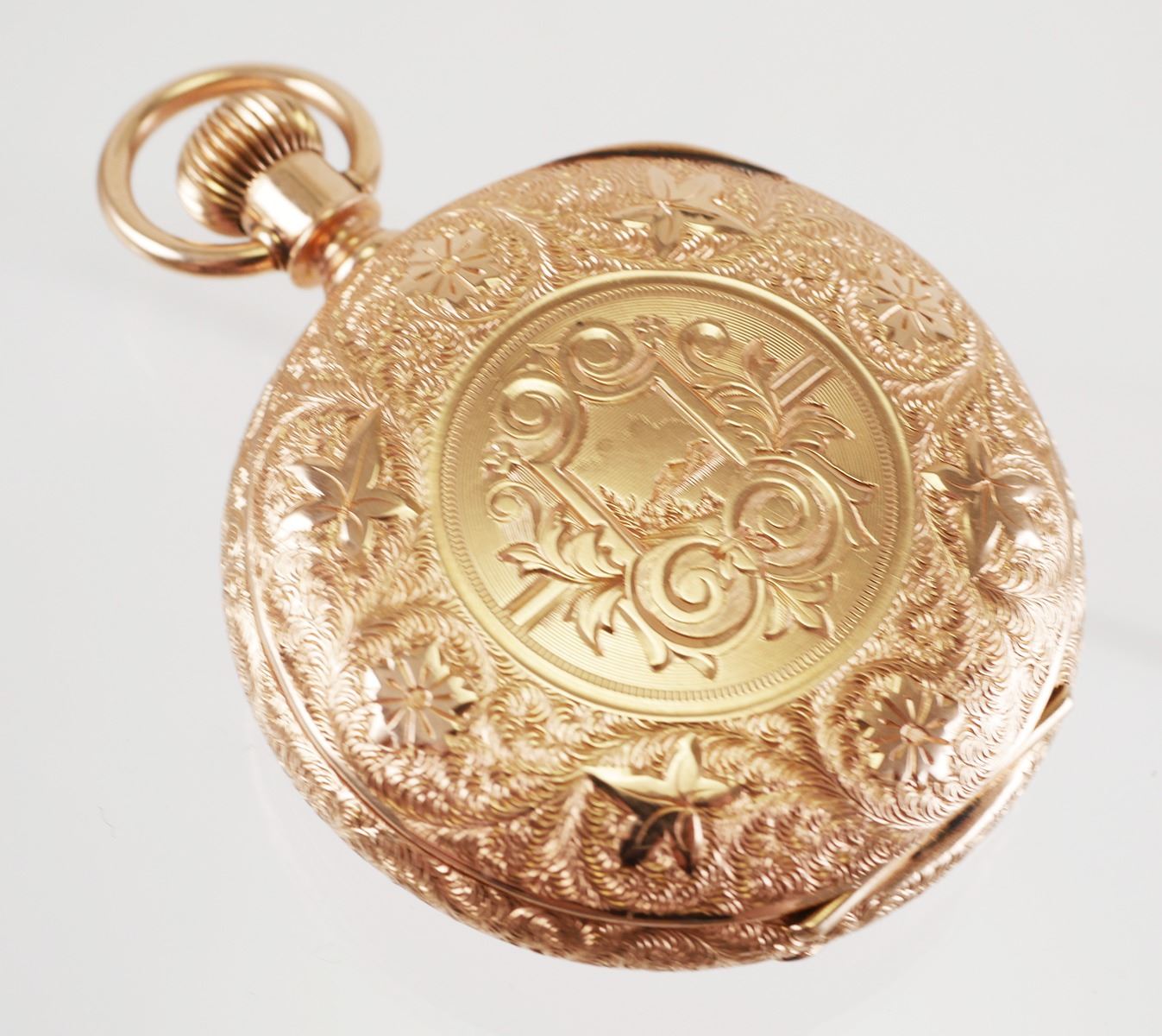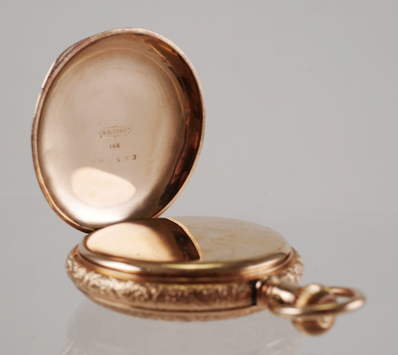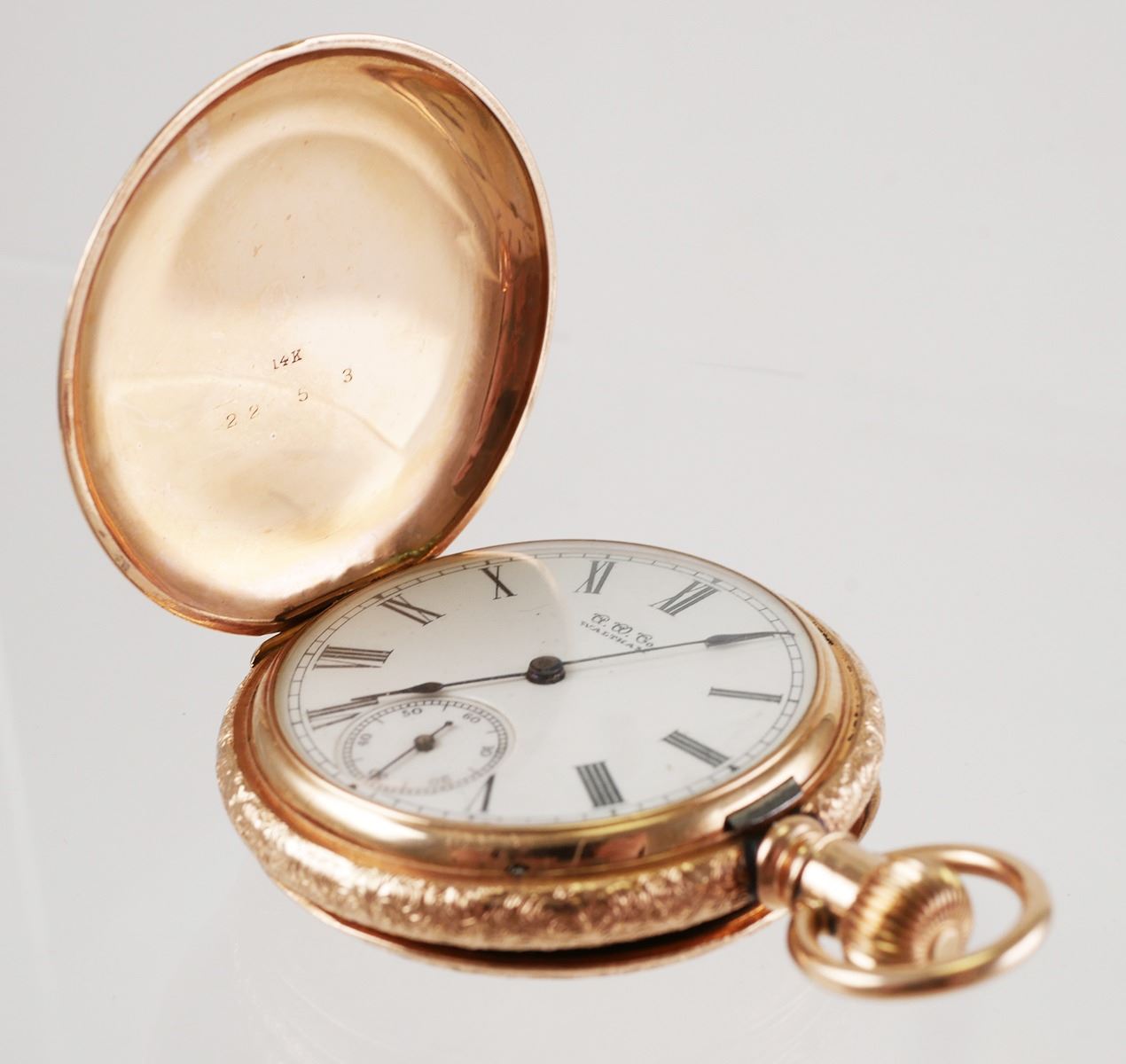 Antique American Waltham Watch Co. 14K gold fancy hunter case pocket watch. Model 1889, Grade H. Pocketwatch is size 6s with 11j. Serial number 4044038. Engraved case measures approx. 41.5mm. Overall weight is 59 grams. 18.8 dwt without movement. No monograms. Watch is in running condition but has not been tested for accuracy. Porcelain dial is marked with roman numerals and has minor wear. Case and movement are in very good condition with light wear. See photos for more details on condition.