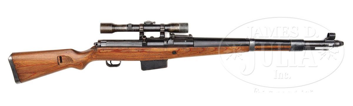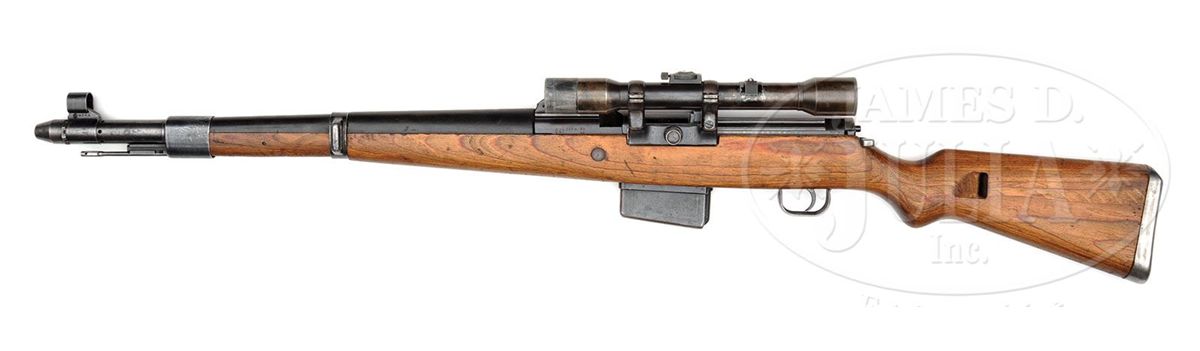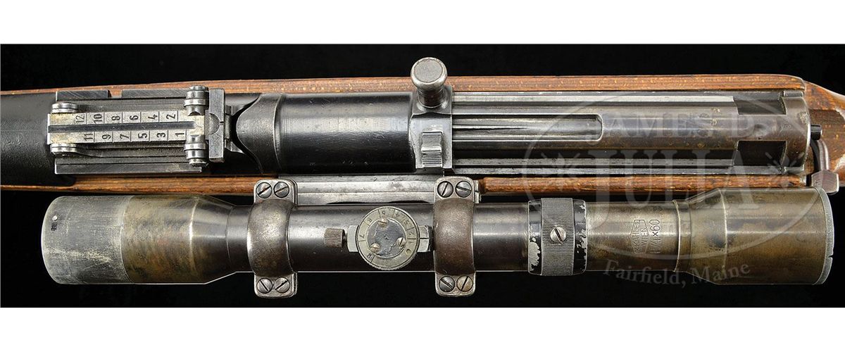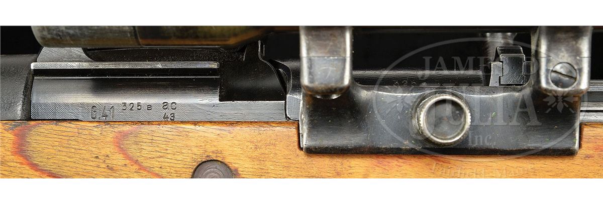 SN 325A. Cal. 8mm. Excellent example of a factory produced Walther G41(W) sniper rifle produced in 1943, with rails cut into the receiver for the ZF40 scope and mount with additional side rail mount added to left receiver, numbered to the rifle. Comes with good condition wartime K. Kahles, Wien 4x60 telescope with 3-post reticule, optics are hazy. Scope is SN 66 on bottom. Side rail mount is unmarked, but appears contemporary to piece. Rifle is WaA 359 proofed on all major parts and stock. All of the rifle's SN's match to include stock and bolt group. Bore is very good to excellent. Orig matching laminate stock with matching plastic handguard. Authentic sight hood. This is an excellent example of a wartime sniper with unusual and rarely seen left side scope and mount. PROVENANCE: Collection of Dr. Geoffrey Sturgess. CONDITION: Very good with 90% of bluing on all metal parts with wear on high edges, magazine, bands as usual with this model. Stock shows few handling marks, but is in overall very good condition. 4-53255 DW3