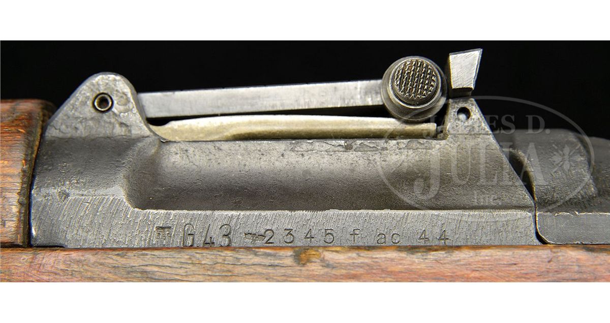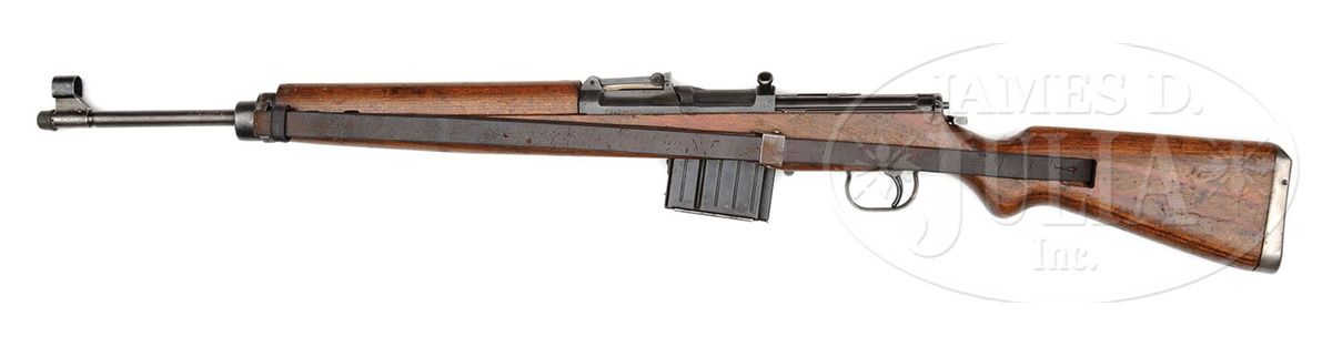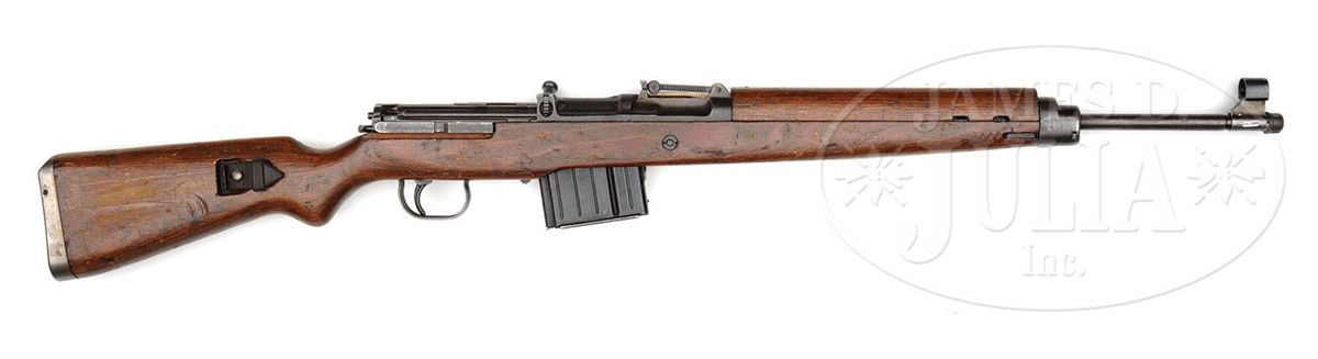 SN 2345F. Cal. 8mm. Walther G43 self-loading rifle produced mid-1944. WaA 359 proofed on all major parts and stock. All SN's match to include stock and bolt group. Has typical British proofs on left bbl. Comes with good condition "aye" ten-rnd magazine, several small replacement parts in the buttstock. Serviceable authentic wartime sling, Mipolam muzzle cover, and authentic sight hood. Overall correct and solid example of wartime production. PROVENANCE: Collection of Dr. Geoffrey Sturgess. CONDITION: Very good. Retains over 90% of blue and phosphate with typical wear on exterior bbl, front band and trigger guard. Bore is good. 4-53256 DW1