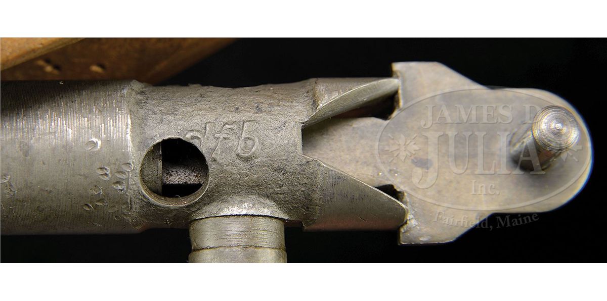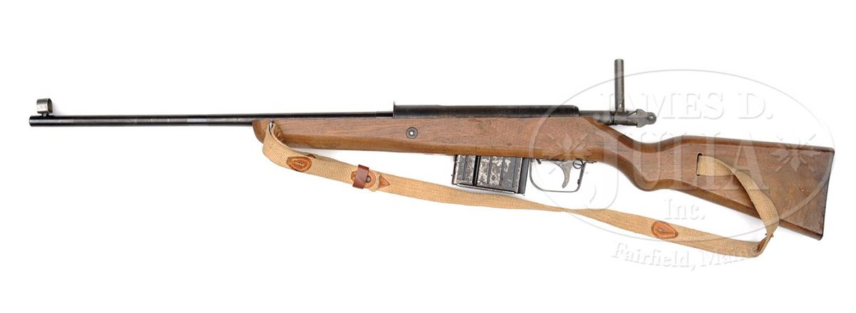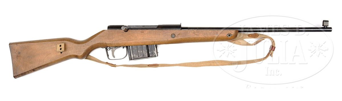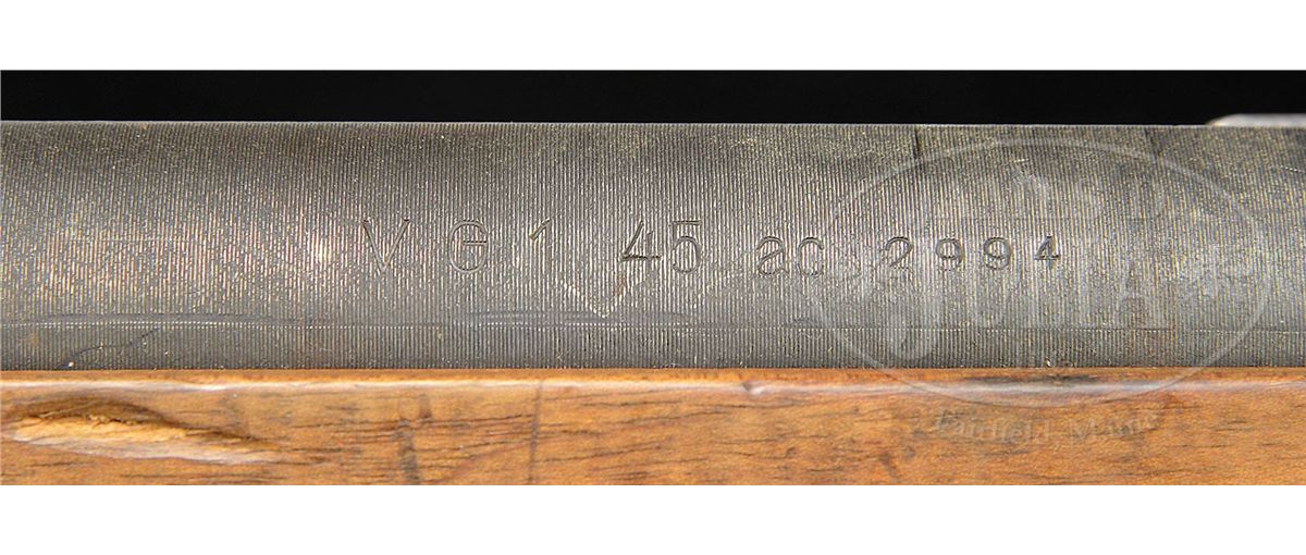 SN 2994. Cal. 8mm. Last ditch WWII, simplified bolt action rifle, manufactured by Walther Werke, Zella-Mehlis, intended to arm the People's Militia. This VG1 is exceptionally scarce retaining 99% of its orig bluing and phosphating. All matching to include simplified bolt. Left receiver is marked "VG1 45 ac 2994". Top receiver and bbl bears Eagle/N commercial proof marks. Bolt body has "dfb" manufacturer's code. Comes with an unmarked purpose-made late war simplified web sling and very good condition "aye" K43 magazine. This exact gun appears on p. 144 of Darrin Weaver's Desperate Measures, The Last Ditch Weapons of the Nazi Volkssturm. Absolutely extraordinary VG1 that would be the centerpiece of any late war collection. PROVENANCE: Collection of Dr. Geoffrey Sturgess. CONDITION: Near unissued. Bore is excellent. Hardwood stock shows just a couple of light scratches and is in excellent condition. 4-53259 DW18