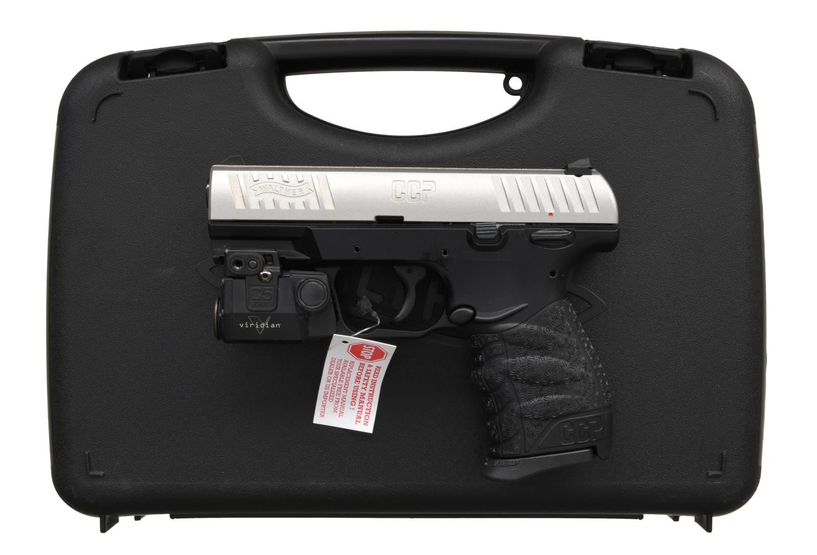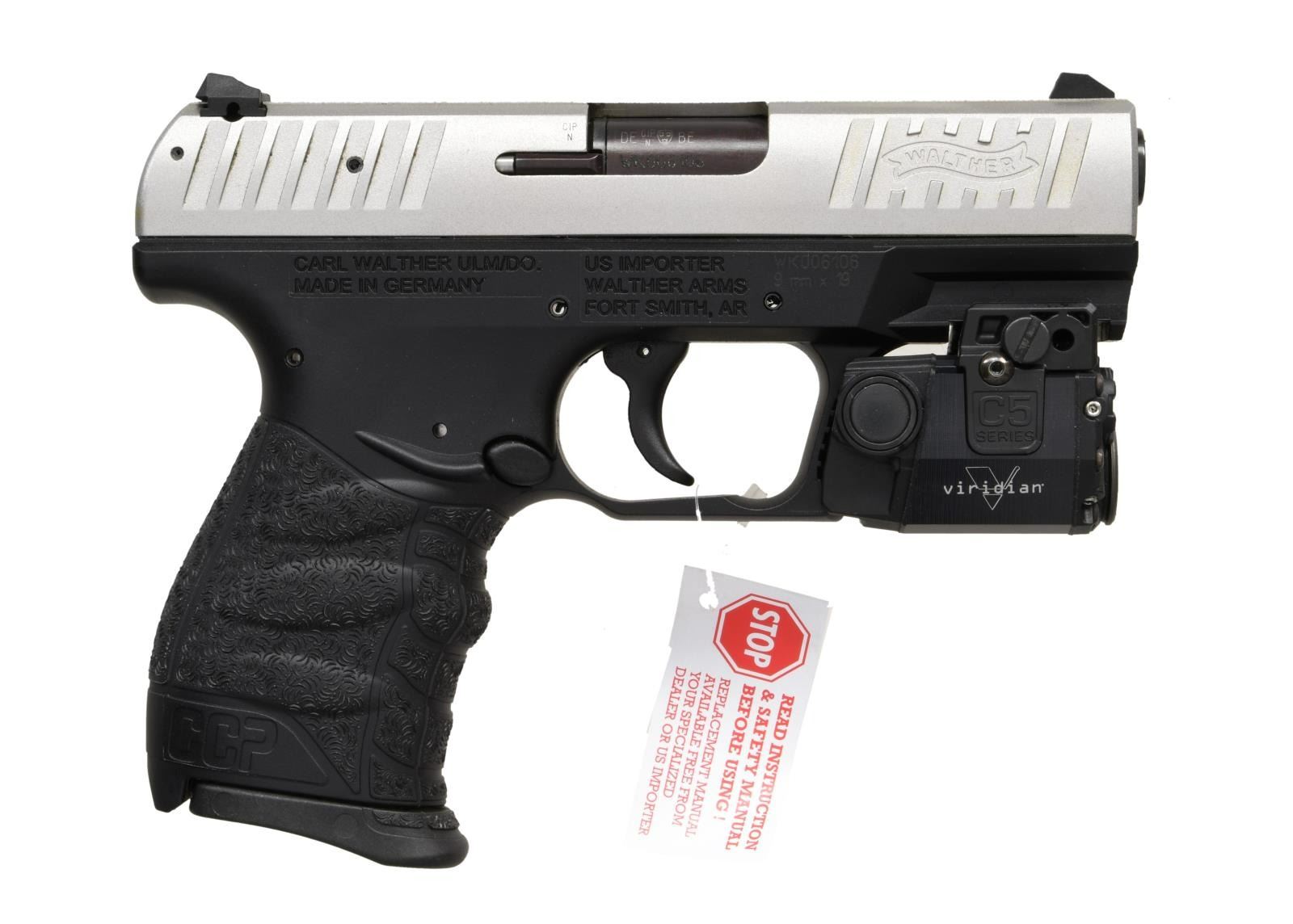 Cal. 9x19 (9mm Luger). S# WK006106 (BE = 2014). Softcoil gas-delayed blowback system, striker fired pistol w/ 3.54" bbl. Stainless steel slide w/ 3 dot sights. Black polymer frame w/ textured grip & Viridian C5 series laser. MAGS: 2 - 8 rd. mag. UNATTACHED ACCESSORIES: matching numbered case containing gun lock, paperwork, cleaning rod & additional sights. CONDITION: near excellent metal & frame finish. Near excellent bore. Laser battery appears depleted. (23-1392/MD). MODERN. $200-300.