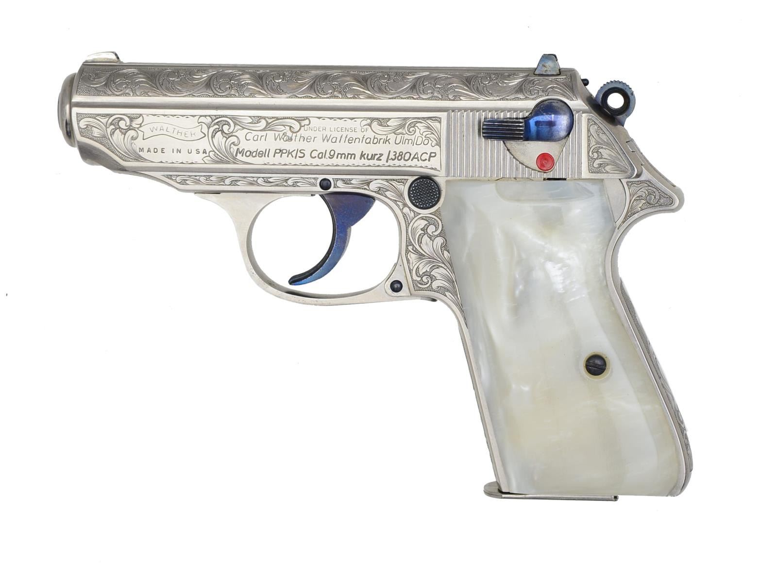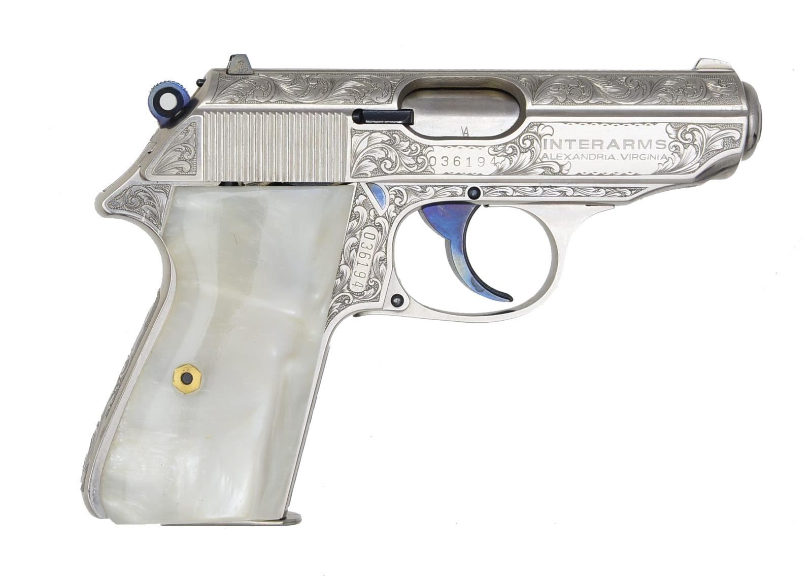 PISTOL. Cal. 380 ACP. S# 036194. Bbl. 3 1/4". Stainless steel construction w/ fire blued trigger, rear sight, mag. release & safety lever. Vine type foliate scroll engraving w/ punch dot background that continues to grip straps & trigger guard bow. 2 Piece synthetic pearl grips. Slide is marked "INTERARMS / ALEXANDRIA, VIRGINIA" & "MADE IN USA". MAGS: 1 detachable 8 rd. UNATTACHED ACCESSORIES: Walther Interarms black box. CONDITION: 99% finish. Bright bore w/ sharp rifling. (20-3816/DS). MODERN. $500-900.