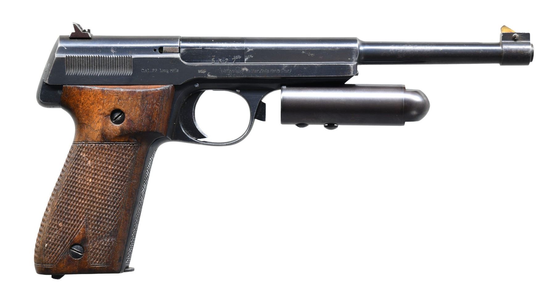 Cal. 22 LR. S# 5327. Bbl. 7 1/2". Model 1925 Olympia semi-automatic pistol mfg. by Walther. Left side of the slide is marked "Walthers Patent" and with the Walther banner logo, with "CAL. 22 long rifle" and Walther's address marked on the right. Right side of the breech is marked with the S#, as well as with a Crown/N commercial nitro proof, which is repeated on the right side of the bbl. and slide. Metal components exhibit a blue finish overall. Frame is mounted with 1-piece checkered wood wrap around grip, and features a cathedral shaped knurled panel on the front grip strap. Adj. replacement brass blade front sight, with adj. U-notch rear sight. Frame is mounted with a finely crafted contemporary cylindrical counterweight, which is numbered to match on the rear face. Slide matches the frame via "327". MAGS: 1 non-matching (S# 163) 10-rd. CONDITION: metal components retain large amounts to the majority of their blue finish, exhibiting areas of wear and thinning that show through to gray patina, some scattered spots of light surface oxidation and pitting, as well as a few spots of touch up blue. Right side of the bbl. exhibits a few patches of mild surface oxidation. Near mirror bore, exhibiting some spots of light pitting, while retaining well defined rifling throughout. Proper manual mechanics. Grip show wear and flaking, as well as scattered marks and impressions from handling and storage, but otherwise remains sturdy and serviceable. (25-3543/MLW). CURIO. $1,500-2,500.