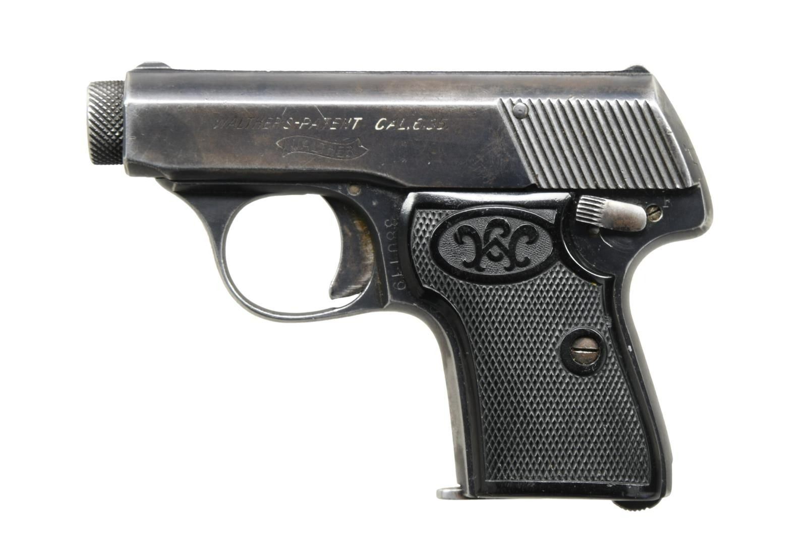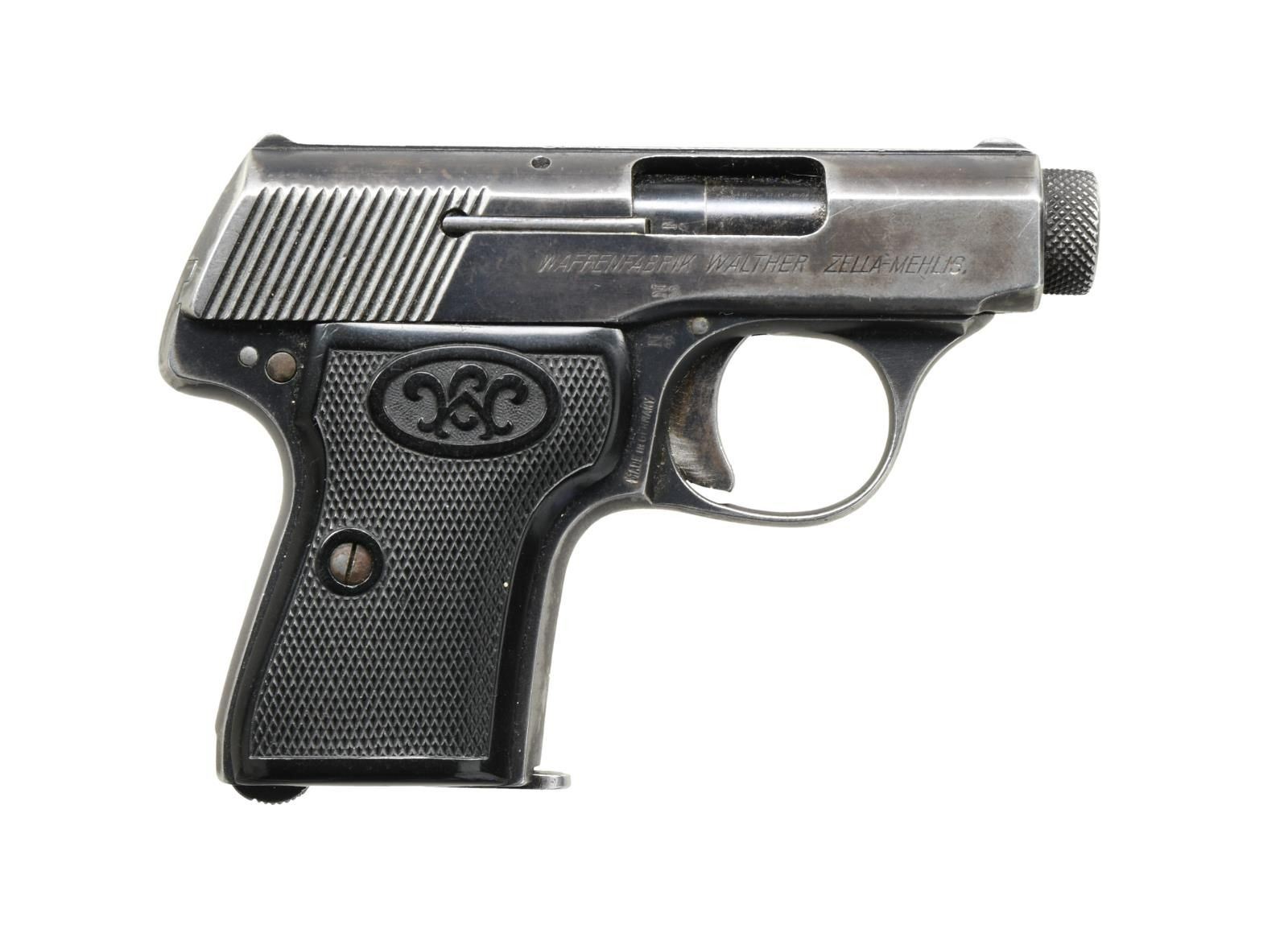 Cal. 6.35mm (25 ACP). S# 380119. Bbl. 2". Blade front sight. U-notch rear sight. Blue finish. Matching numbers on slide & frame. Right side of slide has Zella-Melhis address & crown "N" proof. Left side of slide has Walther Patent & Banner markings. Right side of frame marked "MADE IN GERMANY". Black checkered grips w/ W logo. MAGS: 1-6 rd. that shows some pitting on the baseplate. CONDITION: grips show some dings & handling wear. Metal retains 40% original blue w/ edge wear & overall fading to brown & some light oxidation. Bore has scattered oxidation & frosting but strong rifling. The Collection of Curtis H Halvorson. (23-5834/MJC). CURIO. $300-600.