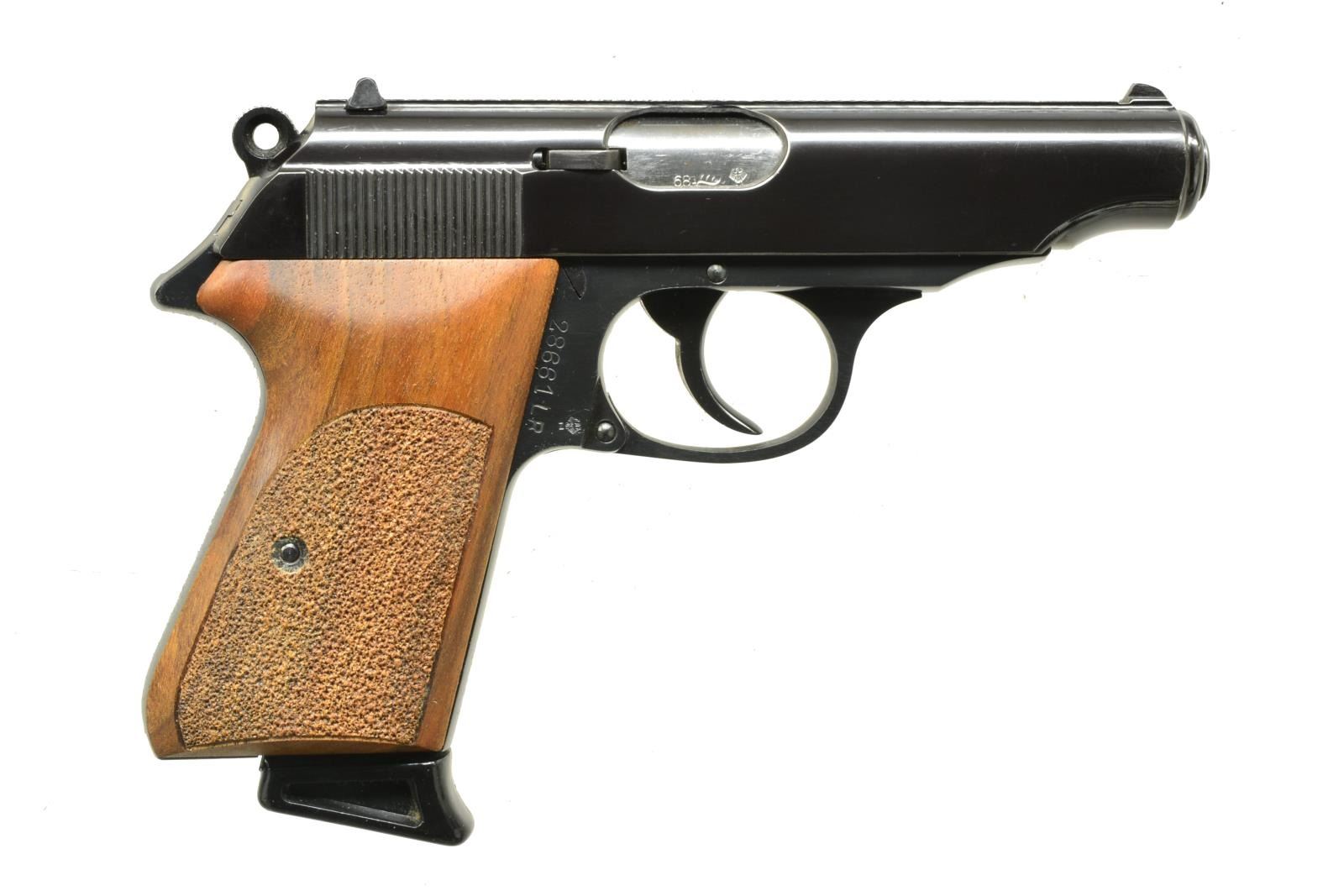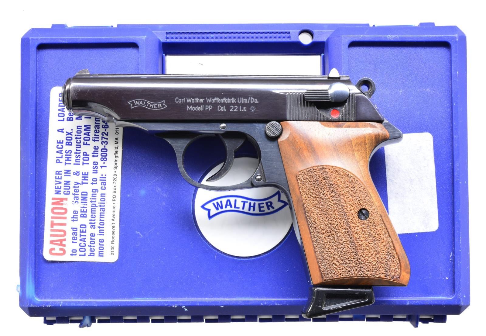 Cal. 22 LR. S# 28661LR. Bbl. 3 7/8". Blued model mfg. 1968. Satin finished grips w/ stippled grip area rather than checkering. Mfg. in Germany w/ eagle N proofs. MAGS: 3-10 rd.; 1 very good w/ finger extension & Walther marked body, 1 good unmarked w/ finger extension & even light peppery oxidation & 1 very good w/ flat base having light high point wear. UNATTACHED ACCESSORIES: near excellent border checkered hardwood grips w/ appearance of Sile mfg. Walther blue plastic case for Model P88. CONDITION: very faint spot on bottom of slide in front of frame; all other aspects near excellent including bore & grips. (20-1837/NW). CURIO. $500-750.