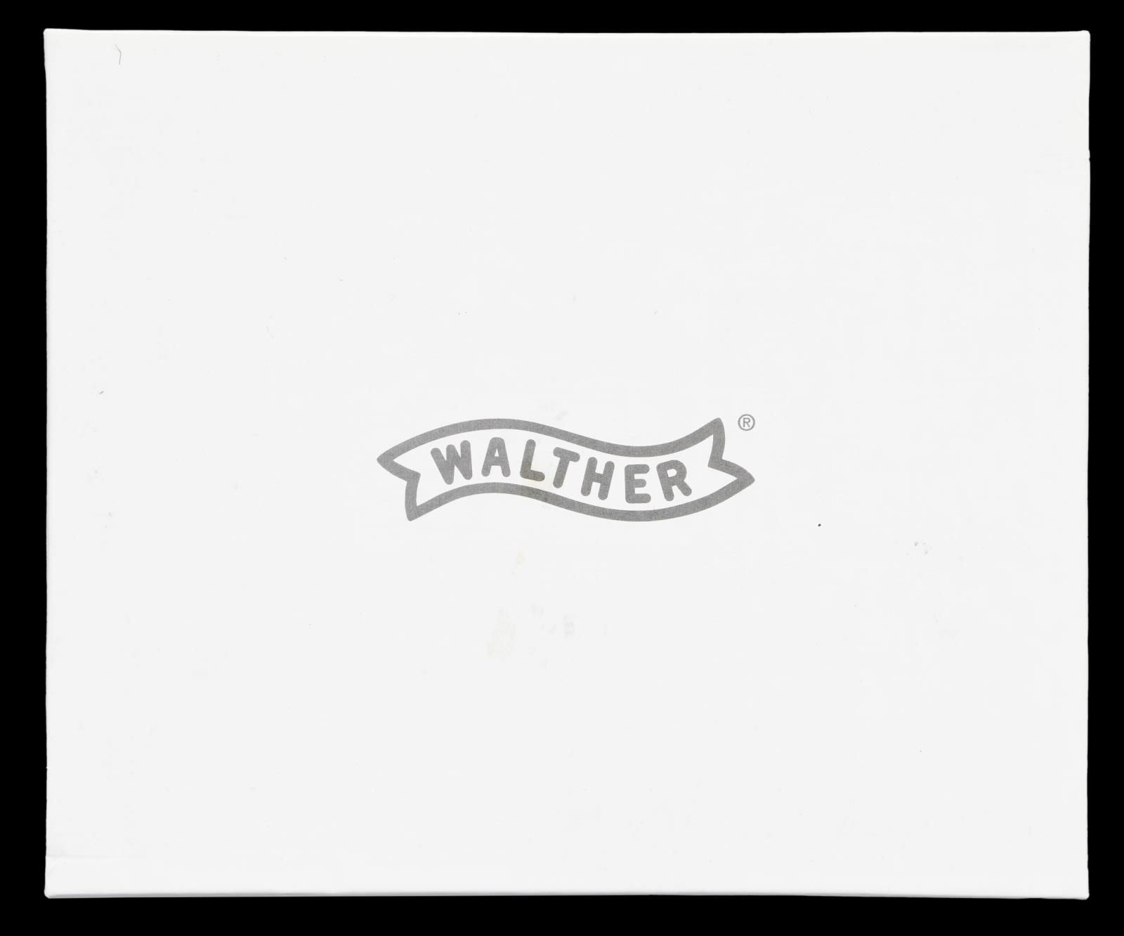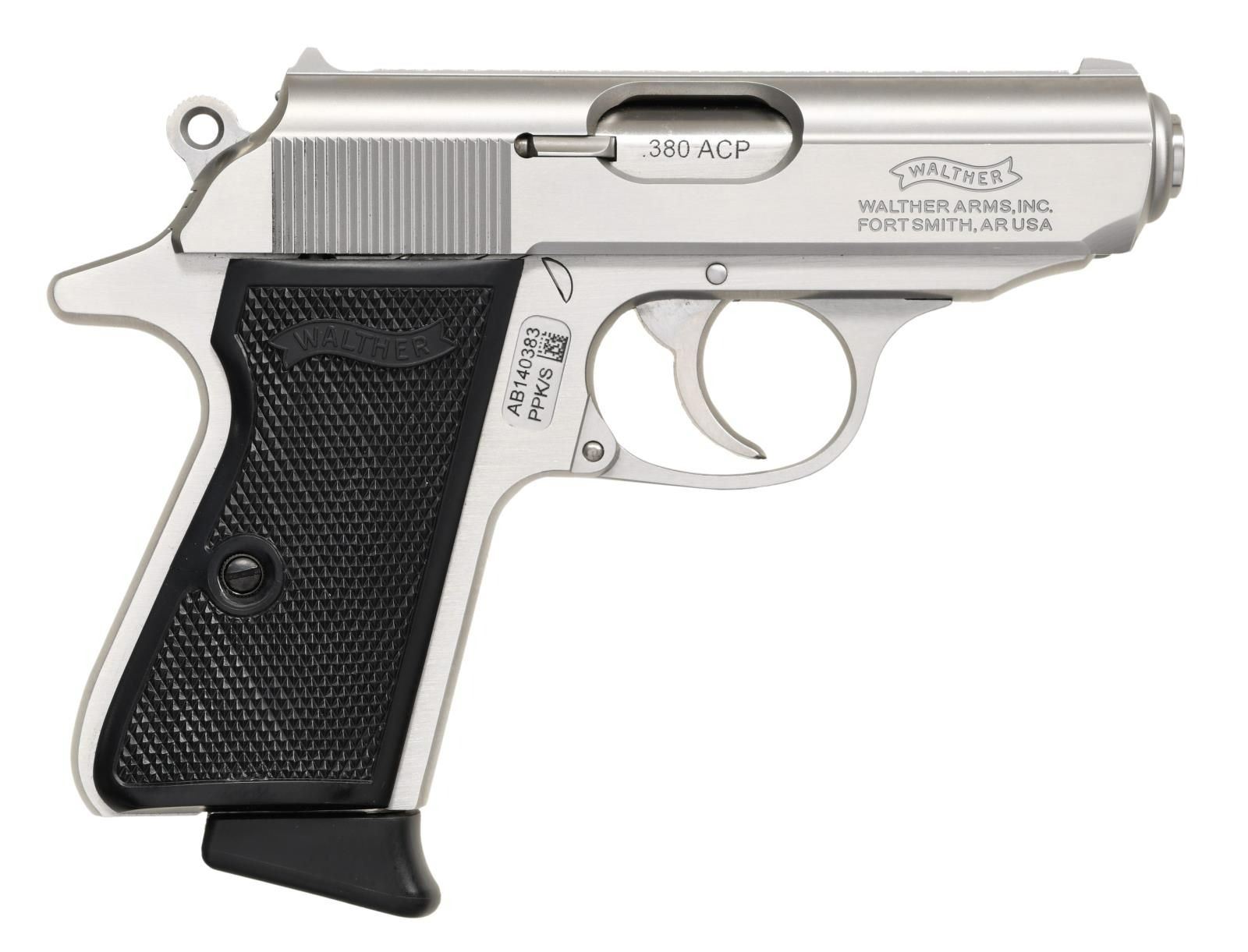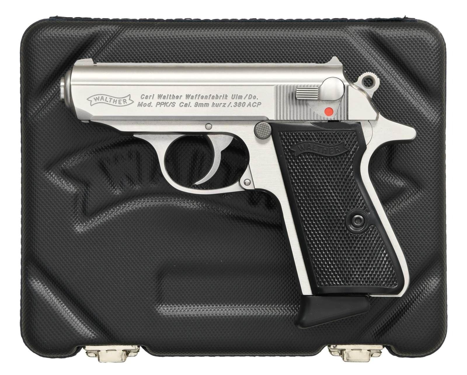Cal. 380 ACP. S# AB140383. Bbl. 3 1/4". Model PPK/S semi-automatic pistol mfg. by Walther and imported by Walther Arms of Fort Smith, AR. Left side of slide exhibits the Walther banner logo, followed by Walther's mfg. information above the model and cal. designations, with the right side exhibiting the Walther banner logo above Walther Arms's importer information. Stainless steel finish with 2 piece checkered black plastic Walther banner grips. Grooved sight rib with blade front sight and square notch rear sight. MAGS: 1-7rd. UNATTACHED ACCESSORIES: w/box. CONDITION: excellent, with metal components retaining virtually all of their original factory finish overall. Mirror bore, exhibiting well defined rifling throughout. Grips are excellent. PROVENANCE: The Collection of Gun Sport Ltd owned by Jon R. Thomas. (23-4207/MLW). MODERN. $700-1,000.