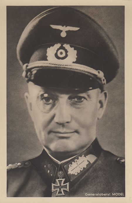 (1891 - 1945) German field marshal who led German armies against fierce Russian resistance at Moscow and Kursk, threw back Montgomery's attack at Arnhem, and killed himself following his defeat in the Ruhr Pocket. Rare S.P., a postcard image of Model in uniform showing him from the chest, up, boldly signed "Model" with inscription in another hand: "East[ern Front], April, 1944, With heartfelt greetings, Heil Hitler Generalfeldmarschall". Recipient's name partly scratched-out, else fine.