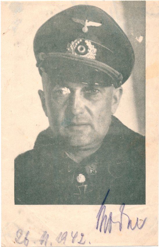 (1891 - 1945) German field marshal who led German armies against fierce Russian resistance at Moscow and Kursk, threw back Montgomery's attack at Arnhem, and killed himself following his defeat in the Ruhr Pocket. Rare S.P. 3 3/4" x 5 3/4" b/w, a paperstock photo of the general in uniform, boldly signed in pencil at lower right. Dated: "26.11.1942"in another hand at bottom. Image a bit light, else fine.