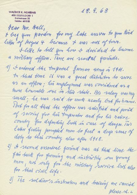 (1892 - 1983) German general, an Afrika Korps commander who enveloped the British on the Gazala Line, led the 1st Panzer Army in Silesia, captured by the Russians. Awarded the Knights Cross with Oak Leaves and Swords. A.L.S., 2pp. 4to., Dusseldorf, Sep. 18, 1968, in english. In part: "...I entered the Imperial German Army in 1911...it was a great distinction to serve as an officer...to work nearly but for honor...soldier's instruction and training are carried out in free nature, in the free terrain and not in a office...the profession of a military officer has many careers and therefore it is very interesting. A clever boy is qualified to become a high-class officer...". He also notes his awards and that he was wounded five times. Fine.