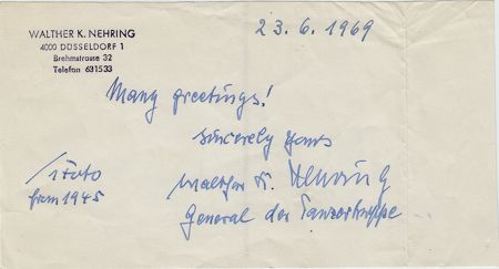(1892 - 1983) German general, an Afrika Korps commander who enveloped the British on the Gazala Line, led the 1st Panzer Army in Silesia, captured by the Russians. His signature in sentiment on the front panel of an envelope, dated June 23, 1969. Fine.