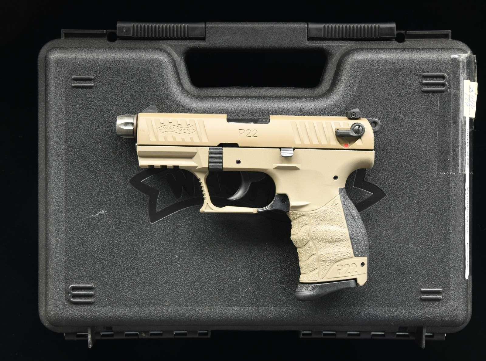 FACTORY BOX. Cal. 22 LR. S# WA354403. Bbl. 3 7/8". P22 Q semi-automatic pistol mfg. by Walther in Germany and imported by Walther Arms. The slide is marked with the Walther banner logo on either side, with "P22" on the left and Walther Arms' importer information on the right. FDE textured polymer frame with matte FDE finished slide. Standard sights with ambidextrous mag. release and slide safety lever. Aftermarket threaded muzzle protector. MAGS: 3 10-rd. UNATTACHED ACCESSORIES: matching factory hard case. CONDITION: excellent, with metal components retaining the vast majority of their original factory finishes overall, exhibiting little wear from use. Thread protector exhibits wear and thinning, but is otherwise fine. Mirror bore, exhibiting well defined rifling throughout. Polymer frame is excellent. PROVENANCE: The Collection of Gun Sport Ltd owned by Jon R. Thomas. (23-4224/MLW). MODERN. $300-450.