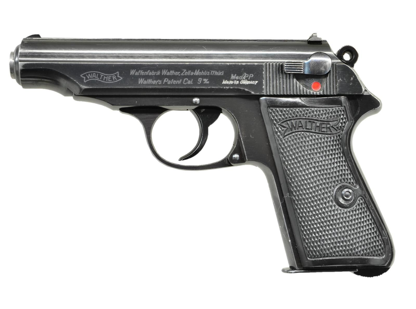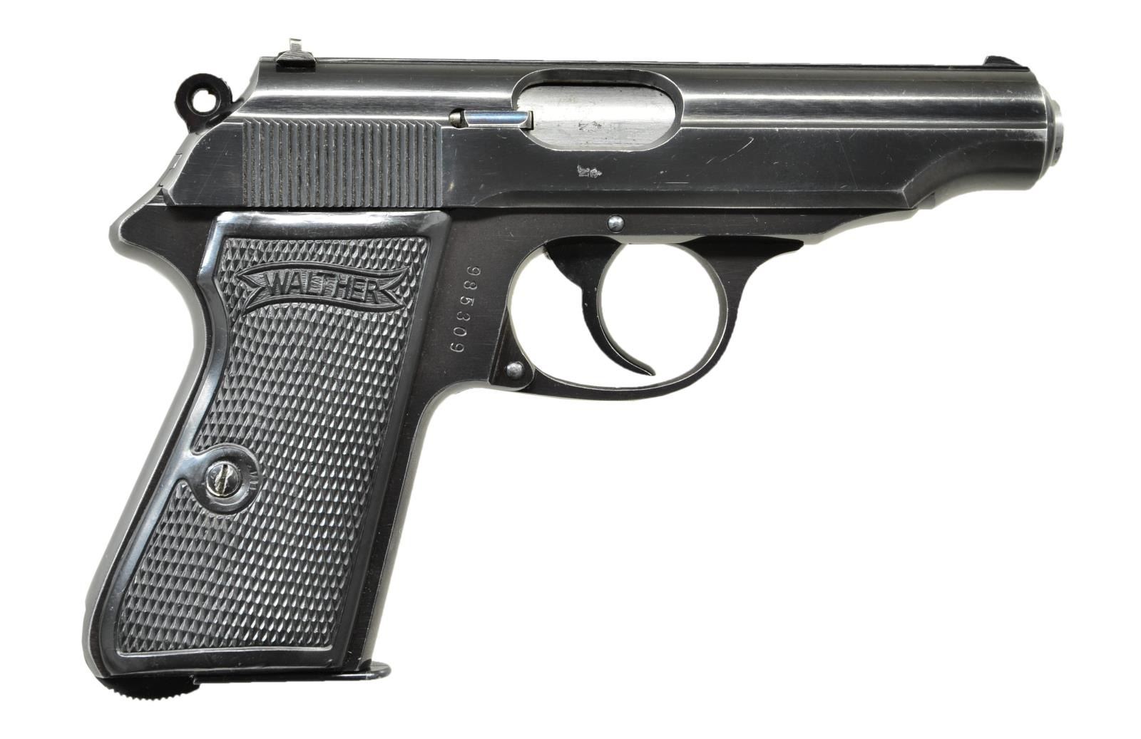 Cal 9mm Kurz (380 ACP). S # 935309. Matching scratch S # on inside of slide. Bbl. 3 7/8". Crown/N proof on right side of slide and Bbl. Left side of slide has standard Walther markings and "Made in Germany" export marking. Checkered plastic grips w/ Walther Banner. MAGS: 1-7 rd. marked w/ Walther banner on left side and "GERMANY" on the spine. CONDITION: grip screw shows some slot damage. Grips show scattered light to moderate handling wear. Metal retains 95% original blue w/ some minor high edge wear and handling marks. Near excellent bore. (22-3063/MJC). CURIO. $500-900.