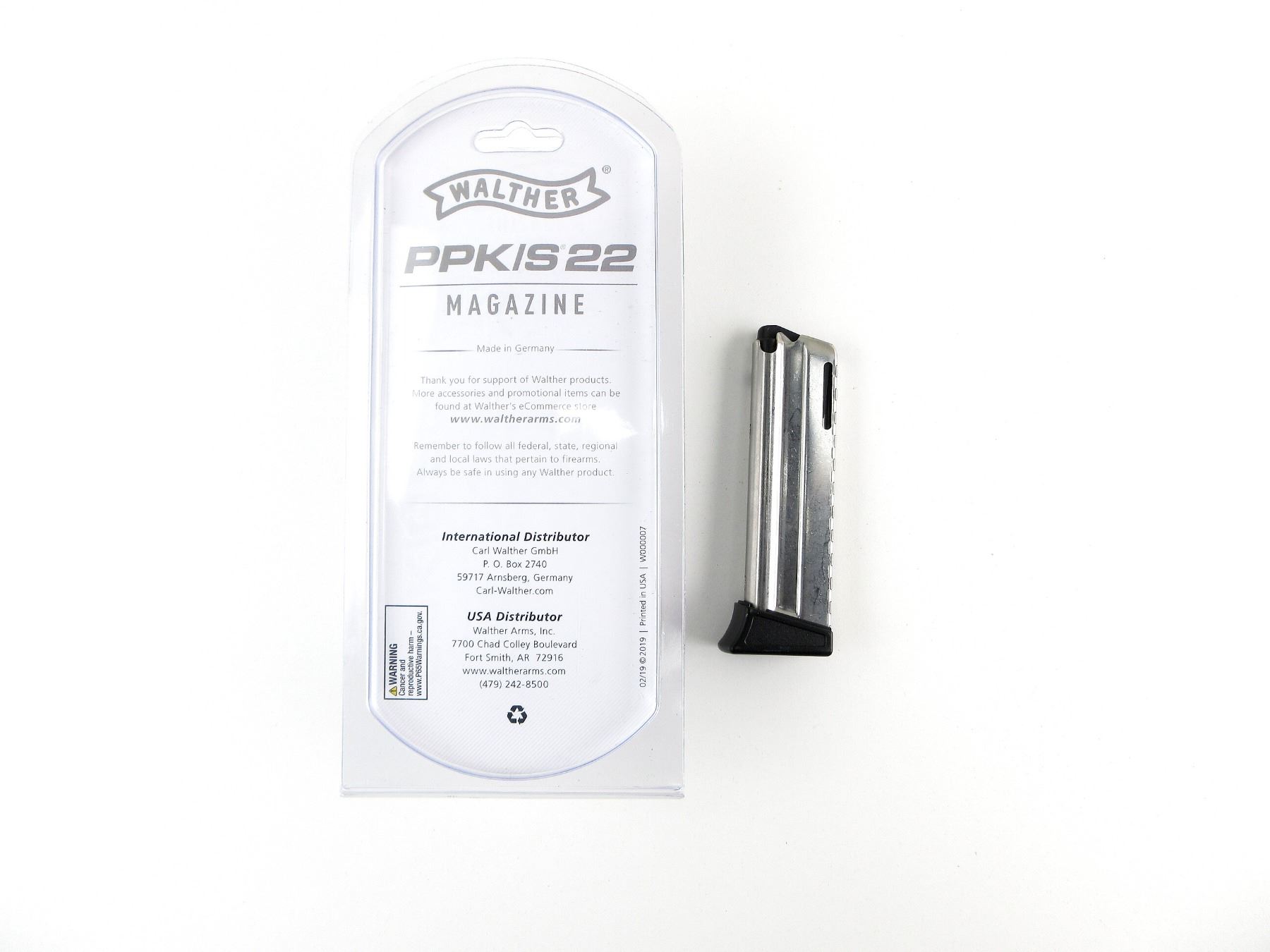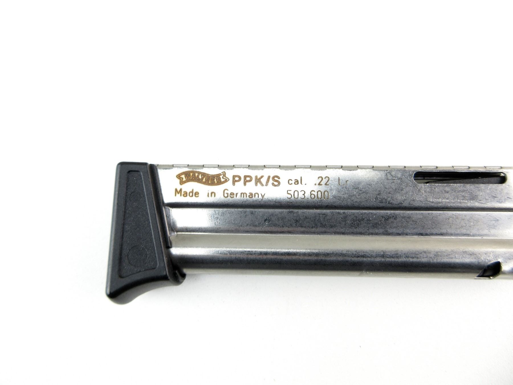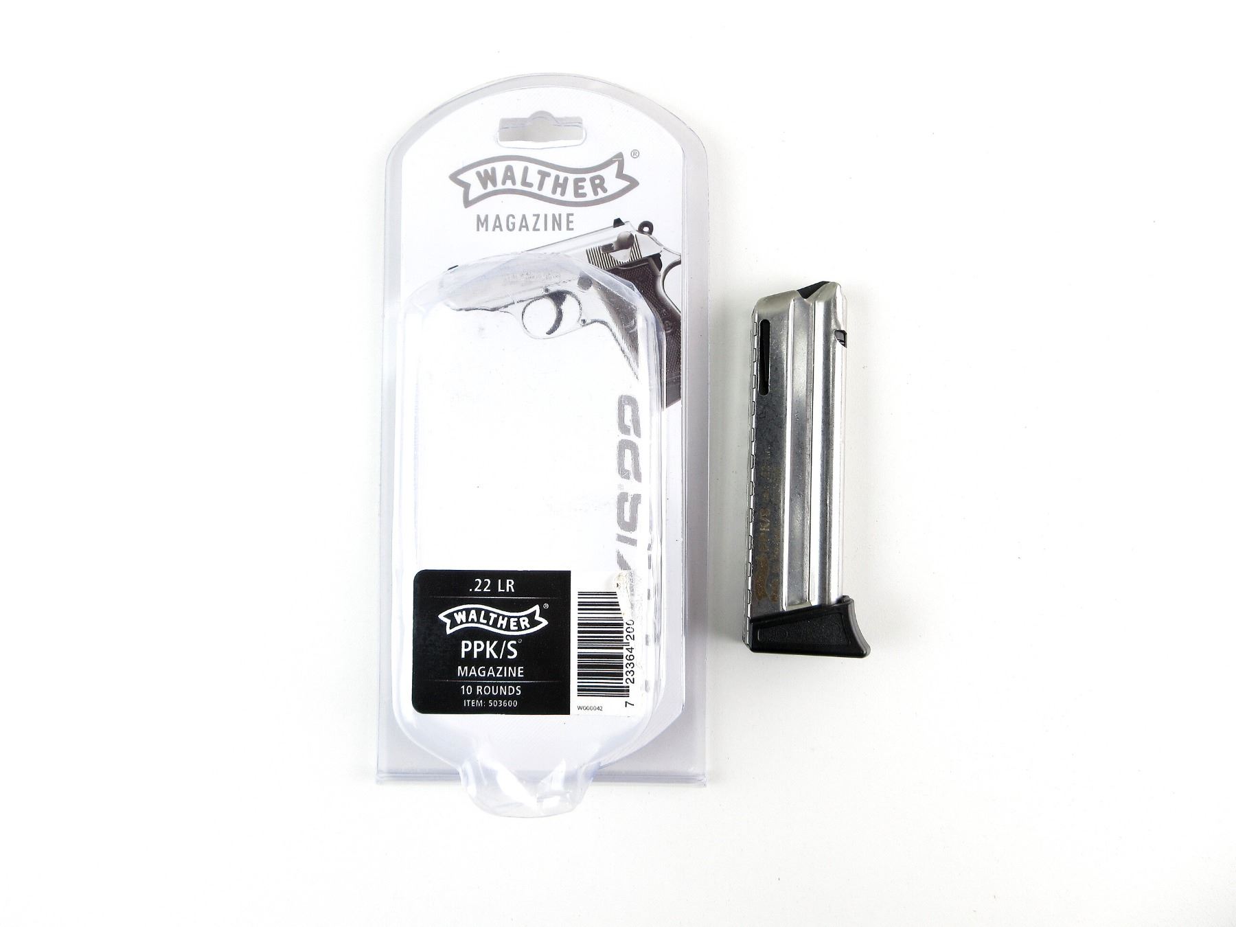 (1) .22 LR MAG, 10 RNDS, STAINLESS STEEL CONSTRUCTION, MARKED: "WALTHER PPK/S", "CAL. .22 LR", "500.600", ETC. BLACK POLYMER BASE, NOS IN ORIGINAL PACKAGING. SEE PHOTOS. PAL REQUIRED.
