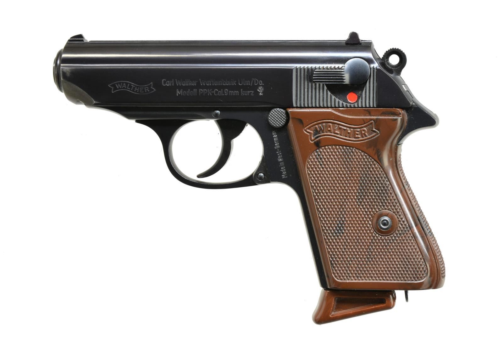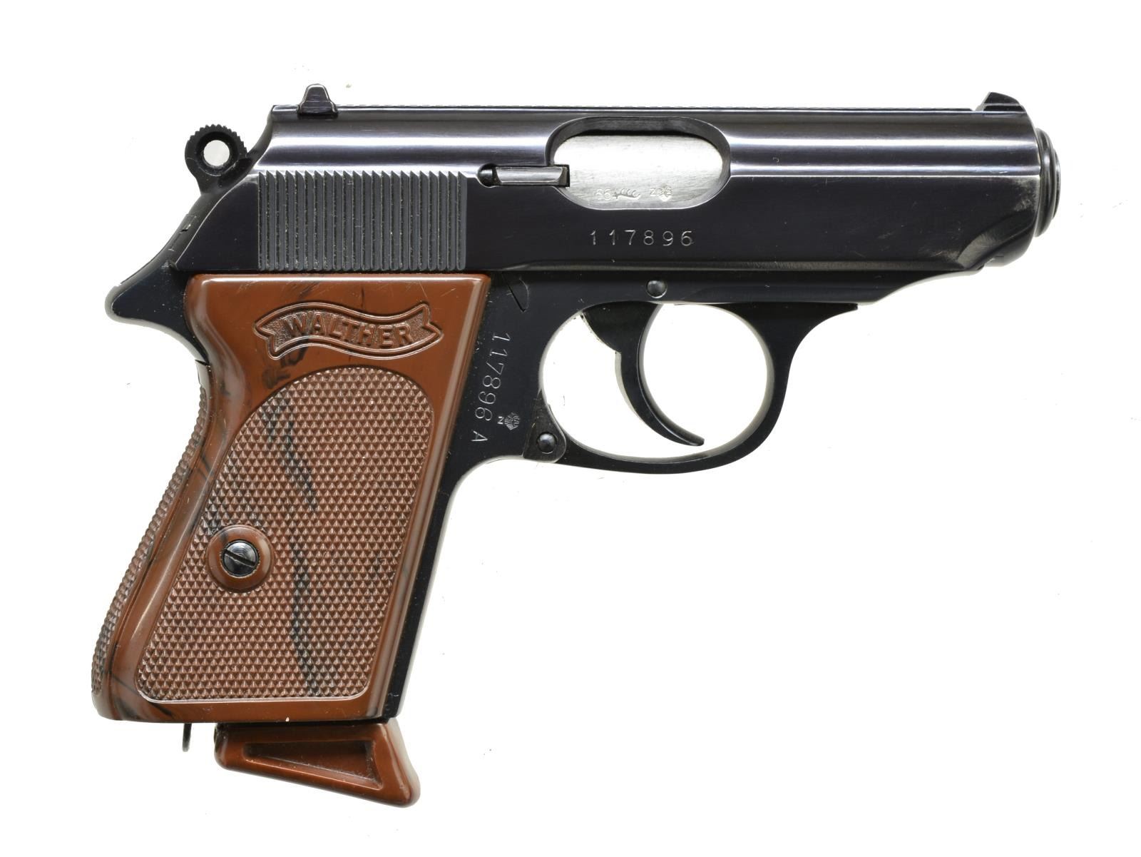 Cal. 9mm Kurtz. S#117896A. Standard post war production w/ eagle “N” proofs dated 1966. Walther information on left of slide which is serial numbered under ejection port. Left side of frame is stamped “Made in West-Germany”. Wraparound plastic grip & unmarked mag. w/ guide rib has a plastic finger extension. CONDITION: fine w/ only a few minor marks & some light holster wear on metal. Grip is very fine. Mechanically fine. (20-3280/MGM). CURIO. $500-800.