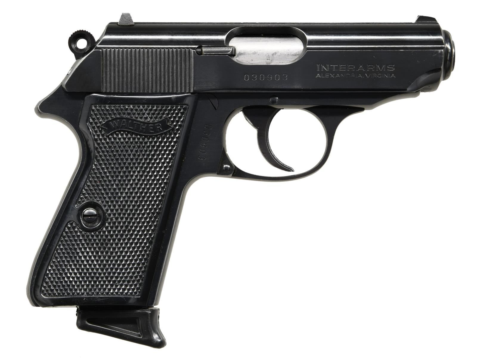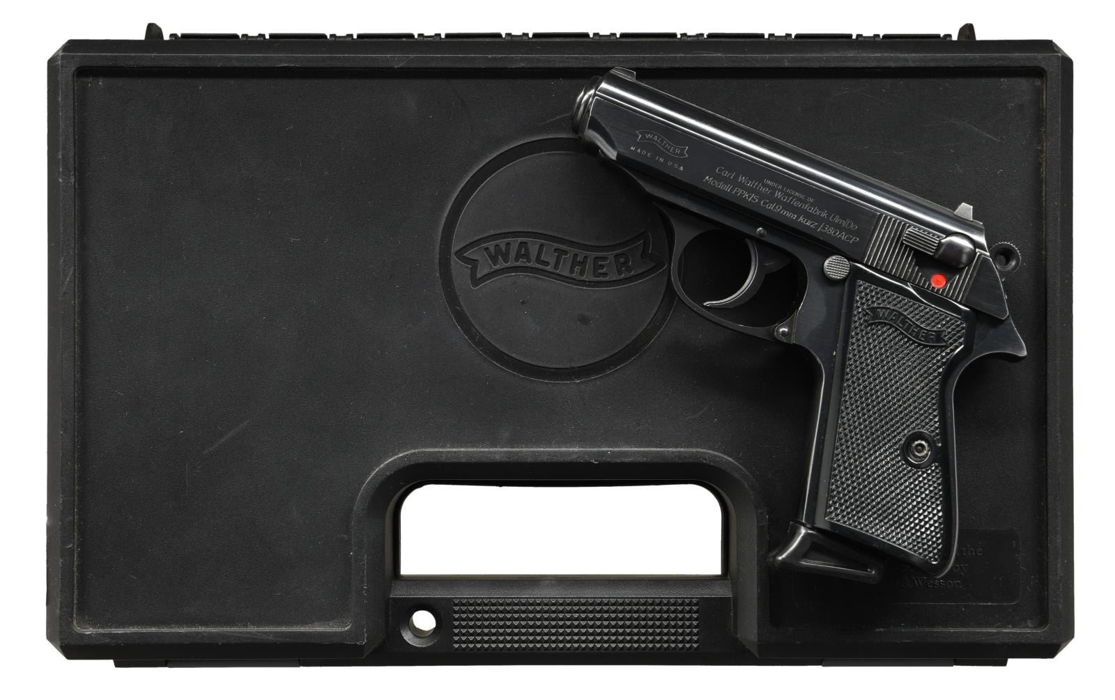 Cal. 380 ACP. S# 030903. Bbl. 3 3/8". Matching numbers on slide & frame. Interarms assembled PPK/S under Walther license in USA. Fixed sights. Blued finish. Walther banner grips. MAGS: 2-7 rd. one w/ black baseplate & one w/o. UNATTACHED ACCESSORIES: S&W/Walther hard case numbered to a different gun w/ paperwork. CONDITION: all aspects near excellent. (23-2267/MJC). MODERN. $400-600.