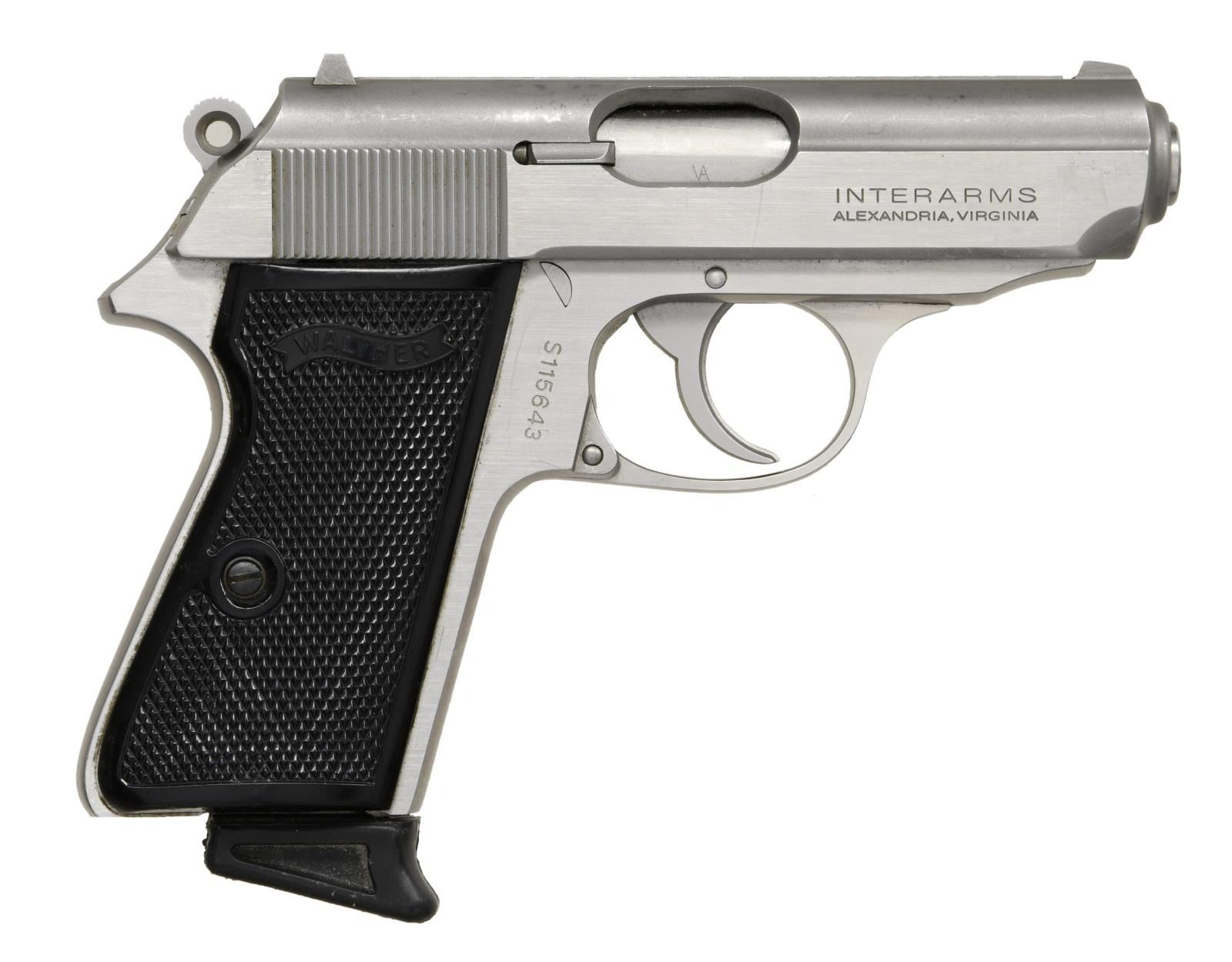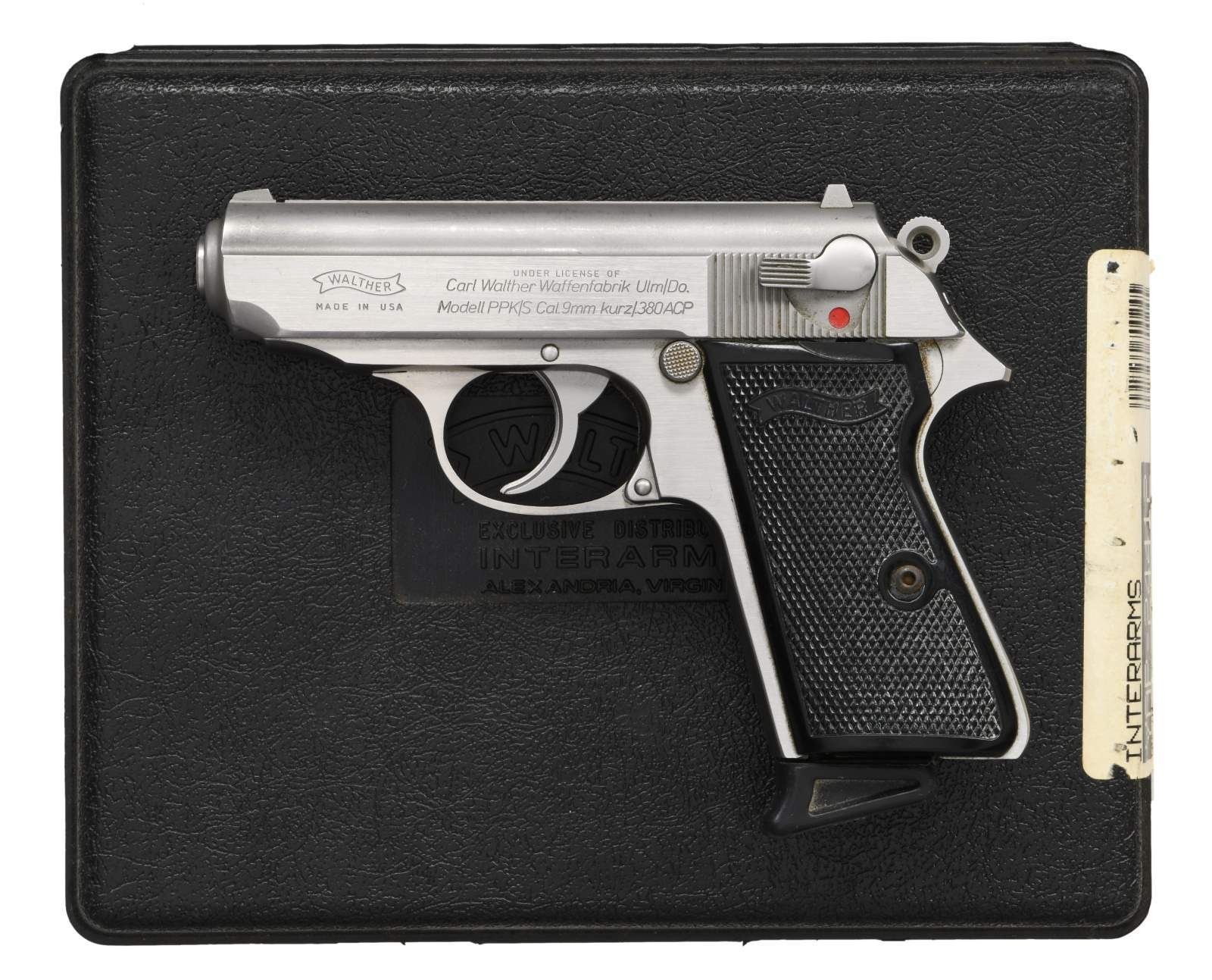 S# S115643. Bbl. 3 3/8". Interarms made PPK/S in USA under Walther license. Fixed sights. Stainless finish. Black Walther banner grips. MAGS: 2-7 rd. stainless factory one w/ black baseplate & one w/o. UNATTACHED ACCESSORIES: factory hard case matching numbered to gun w/ cleaning rod, test target & factory paperwork. CONDITION: all aspects rate very good or better w/ some light handling wear. (23-2271/MJC). MODERN. $400-600.