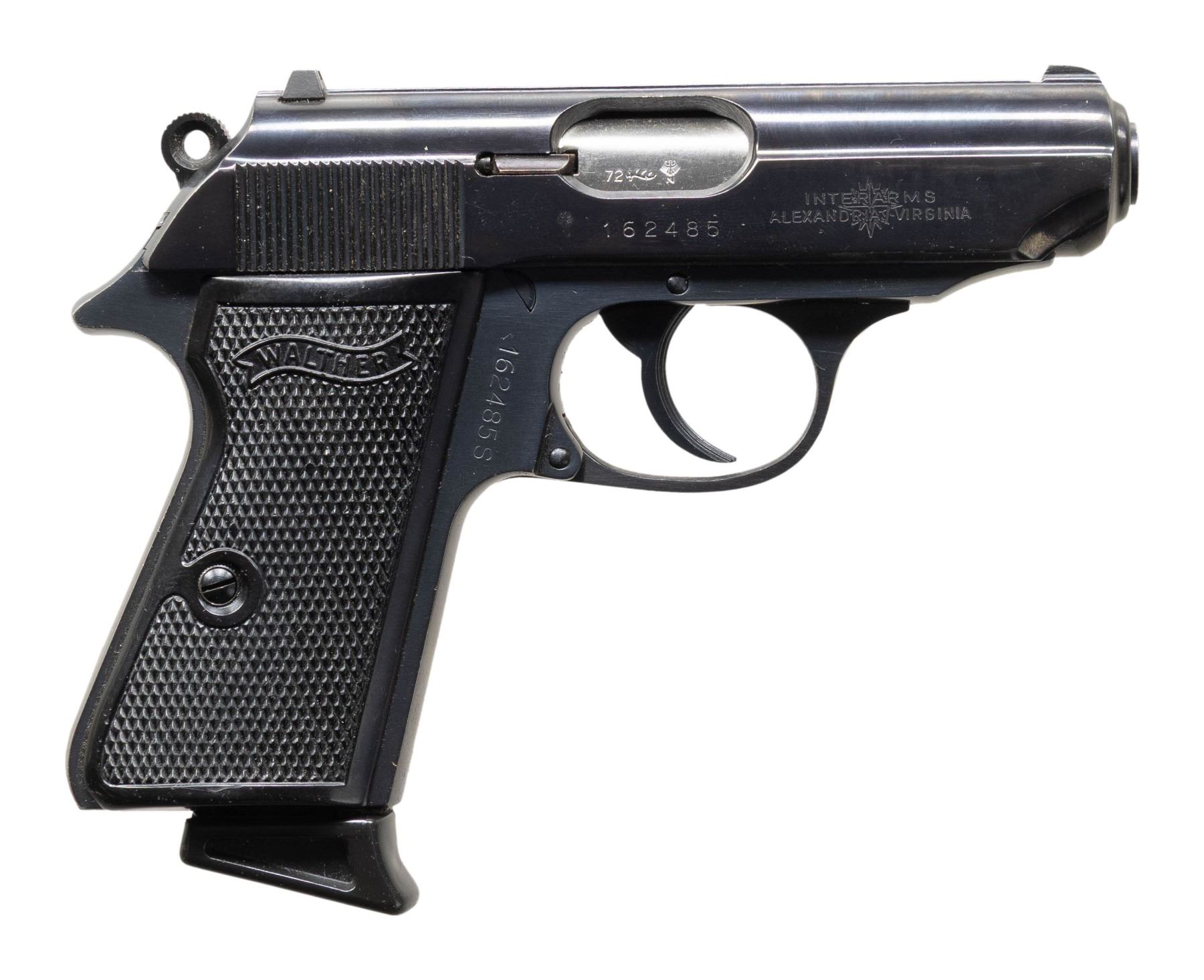 CASE. Cal. 9mm Kurz. S# 162485S. Bbl. 3 1/4". PPK/S semi-automatic pistol mfg. in West Germany by Walther in 1972 in accordance with the Gun Control Act of 1968. Left side of the slide is marked with the Walther banner logo above "Made in W. Germany", followed by markings stipulating Walther's mfg. information, as well as the model and cal. designations, with a Crown/ N commercial nitro proof, the S#, and an Interarms' import mark on the right. Right side of the chamber is marked with the 2-digit year of mfg. "72", a Ulm Proof House antler, and an Eagle/N proof. Metal components exhibit a blue finish overall, save for on the chamber area, which is polished in-the-white. Frame is mounted with 2-piece Walther banner checkered black synthetic grips. Slide features a matte grooved rib, with an integral blade front sight and dovetailed square notch rear sight. Matching numbers are present on the frame and slide. MAGS: 1 7-rd. mag. with black synthetic grip extension. UNATTACHED ACCESSORIES: later production Walther blue polymer hard case. CONDITION: metal components retain the vast majority of their original blue finish, showing some spots of light edge wear, with scattered spots of light surface oxidation present on the grip straps. Brilliant mirror bore, retaining well defined rifling throughout. Proper manual mechanics, including the safety lever / decocker. Grips show mild smoothing and scattered superficial marks from handling and storage, but otherwise remain sturdy and serviceable. (25-3660/MLW). CURIO. $400-600.