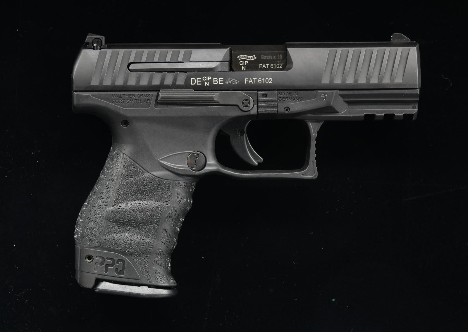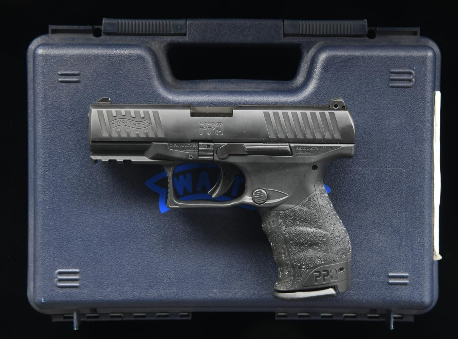 FACTORY CASE. Cal. 9x19mm Parabellum. S# FAT6102. Bbl. 3 7/8". PPQ M2 semi-automatic pistol mfg. by Walther in Germany and imported by Walther Arms'. The slide is marked with the Walther banner logo on either side, with the left being marked "PPQ", and the right with the date code, an Ulm Proof House mark, as well as the S#. Textured black polymer frame with matte black slide and bbl. Standard sights with ambidextrous slide release. MAGS: 2 15-rd. UNATTACHED ACCESSORIES: matching factory hard case. CONDITION: near new, with metal components retaining virtually all of their original factory finishes overall. Mirror bore, exhibiting well defined rifling throughout. Polymer frame shows a few very light superficial marks from handling and storage, but is otherwise excellent. PROVENANCE: The Collection of Gun Sport Ltd owned by Jon R. Thomas. (23-4510/MLW). MODERN. $300-500.