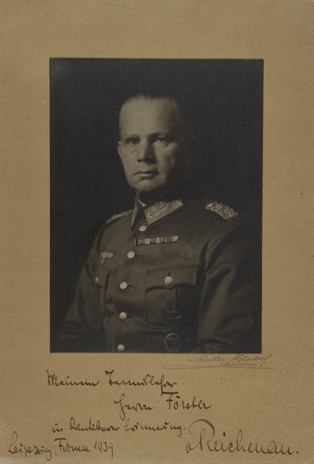 (1884 - 1942) German field marshal who commanded the Tenth Army in the invasion of Poland, and the Sixth Army in the invasion of France and in the taking of Kiev and Kharkov. Reichenau supported the work of the SS Einsatzgruppen in exterminating the Jews in the occupied Soviet territories, yet may have been plotting against the Nazi hierarchy. Died of either a heart attack...or at the hands of the Gestapo. Rare I.S.P., 6 1/2" x 9 1/2" b/w, a chest, up pose in uniform inscribed to a fellow officer and signed on the lower mount, Liepzig, February, 1939. Also signed by the photographer. Mount slightly toned, a light crease through signature, else very good.