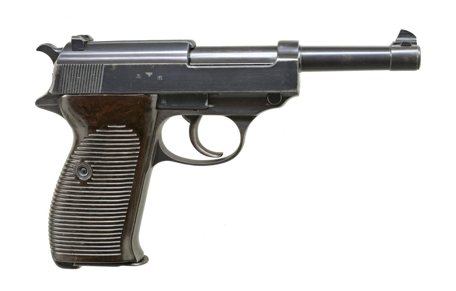 Cal. 9mm Luger. S# 8691d. Bbl. 5". Mfg. 1941. as second variation (S# 4833b to 4527i) w/ eagle 359 plus matching numbers on frame, slide, bbl. & locking block; also scarce matching mag. Eagle 359 proof on all sm. parts. Slide has eagle party symbol. Dark brown bakelite grips. MAGS: 2 good to very good blued 8 rd. TOTAL; lower left of bodies marked "P.38" plus eagle 359 on spines; 1 base numbered 8691d. UNATTACHED ACCESSORIES: good oiled black flap holster w/ staple & strap retention; detached lift strap. Double belt loops on back along w/ "P38", eagle party symbol over "WaA 195" & "dla / 42" (Karl Barth). CONDITION: very good appearance w/ light high point wear. Very good to excellent grips. Slight peppery oxidation on front strap. 3 Sm. areas of cleaned light pitting near left top of bbl. at chamber area. Good to very good bore w/ some areas of faint cleaned pitting. (20-3360/NW). CURIO. $1,500-2,200.