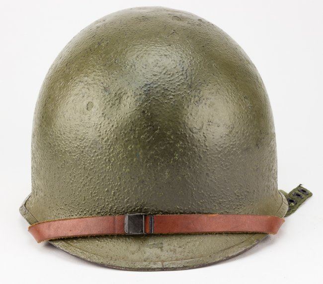 War-date M1 helmet, excellent sand-finish paint, seam at front. Swivel type bails and "A" clips but with a post-war Steinberg sweat band, straps also post-war. Sold with two additional helmets, a 50s production helmet and liner, exteriors of both crudely repainted, along with a repro camouflaged helmet with liner. Three pieces.