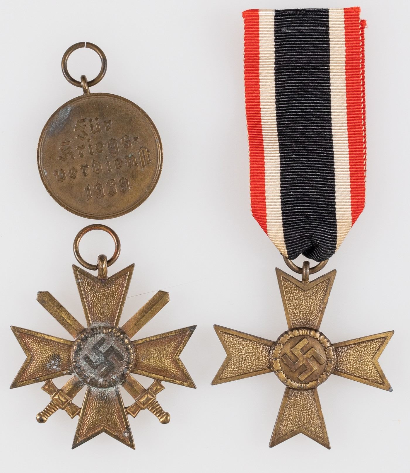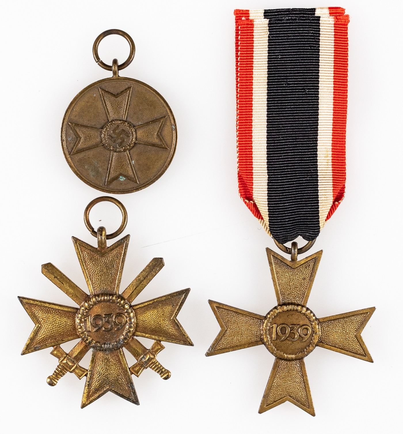 Group of three German WWII War Merit Crosses, one with swords and one for civilians. Not maker marked. One has ribbon. Dated 1939. Sold as-is.