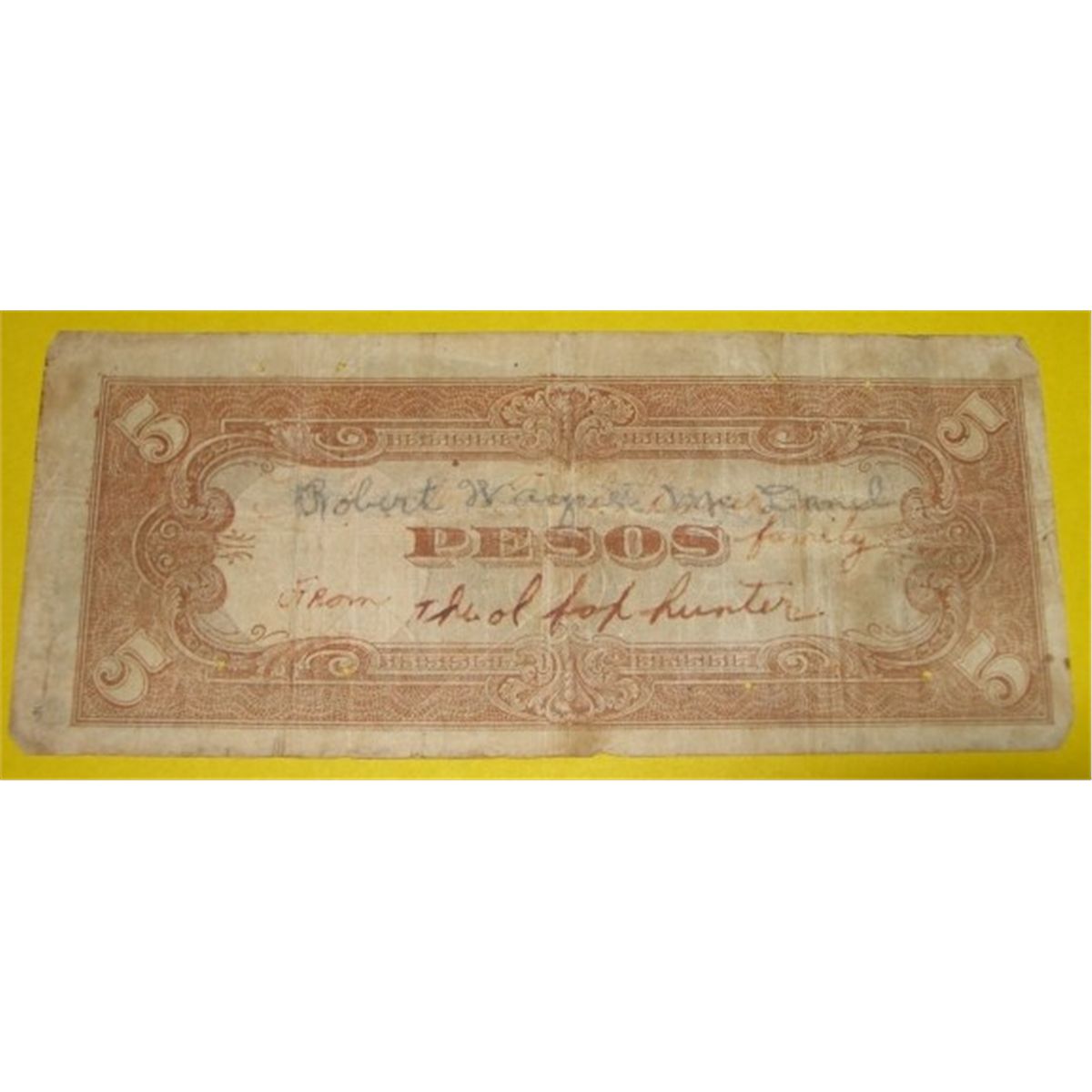WAR Note with Writing from Soilder on it says "PHILIPPINE ILS FEBRUARY 23, 1945* This is a $5 Five Pesos Japanese Note!! ***Coin & Currency Grades, Conditions & Values are not Safe Deposit Coins Responsibilty. Grades, Conditions & Values are determined by Consigner(s) & Buyers***