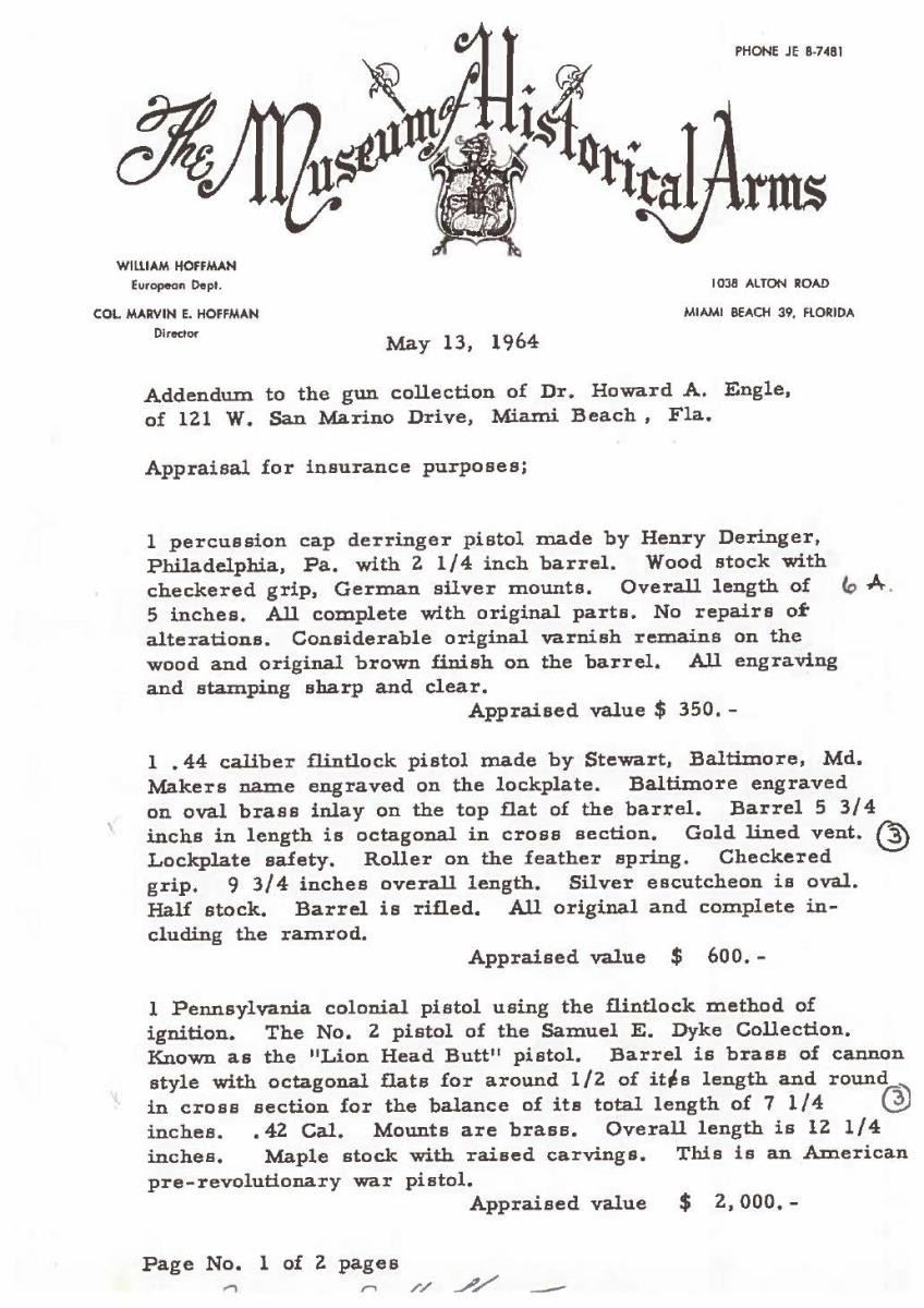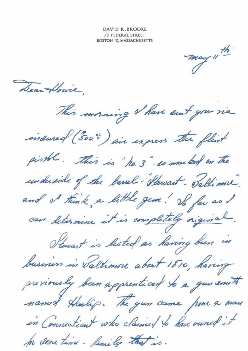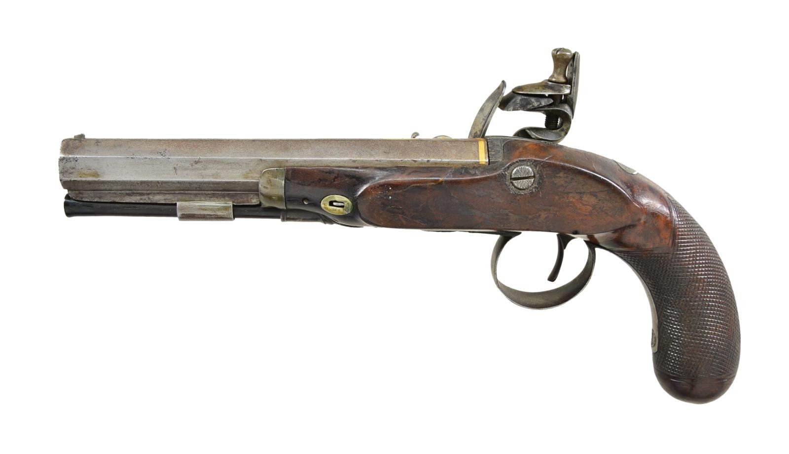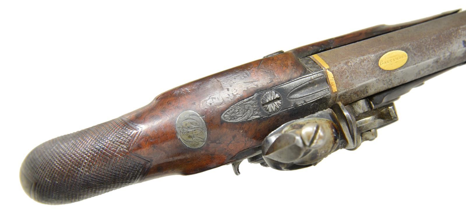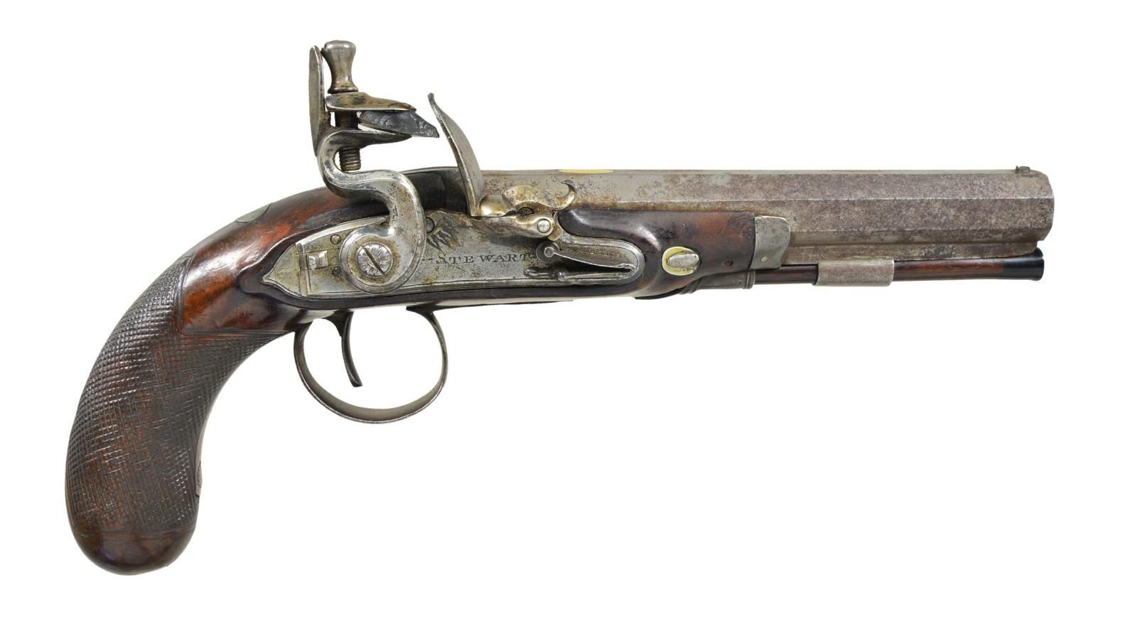 Cal. 40. NSN. 10" Overall, 5.75" oct. bbl. w/ gold band & “BALTIMORE” inset in gold oval. Inset silver front sight, gold touch hole, fine lock engraved “STEWART” for John M. Stewart who was listed as a gunsmith in Baltimore city directories from 1810-1815 at 6 Light Street. Lock is nicely beveled w/ bridled roller frizzen, locking safety & unsupported serpentine cock. Trigger bow is engraved w/ patriotic crossed flags & drum, pewter nosecap, ebony tipped ramrod w/ attachable fitted worm. Small oval silver thumbplate has script monogram of owner. There are no internal proofs on lock or barrel. internally marked “No. 3”. UNATTACHED ACCESSORIES: letter dated 1965 offering this pistol & telling its history & “authenticated as American”. CONDITION: good overall. Metal overall gray, bbl scattered pitting, triggerguard missing front screw, ramrod thimbles loose, right key way escutcheon loose. Stock is sound w/ worn diamond point checkering, crack repair on left side, retaining strong traces of original varnish. Mechanically sluggish, will not hold full cock, safety is functional, good discernible rifled bore. (01-21181/JS). ANTIQUE. $3,000-4,000.