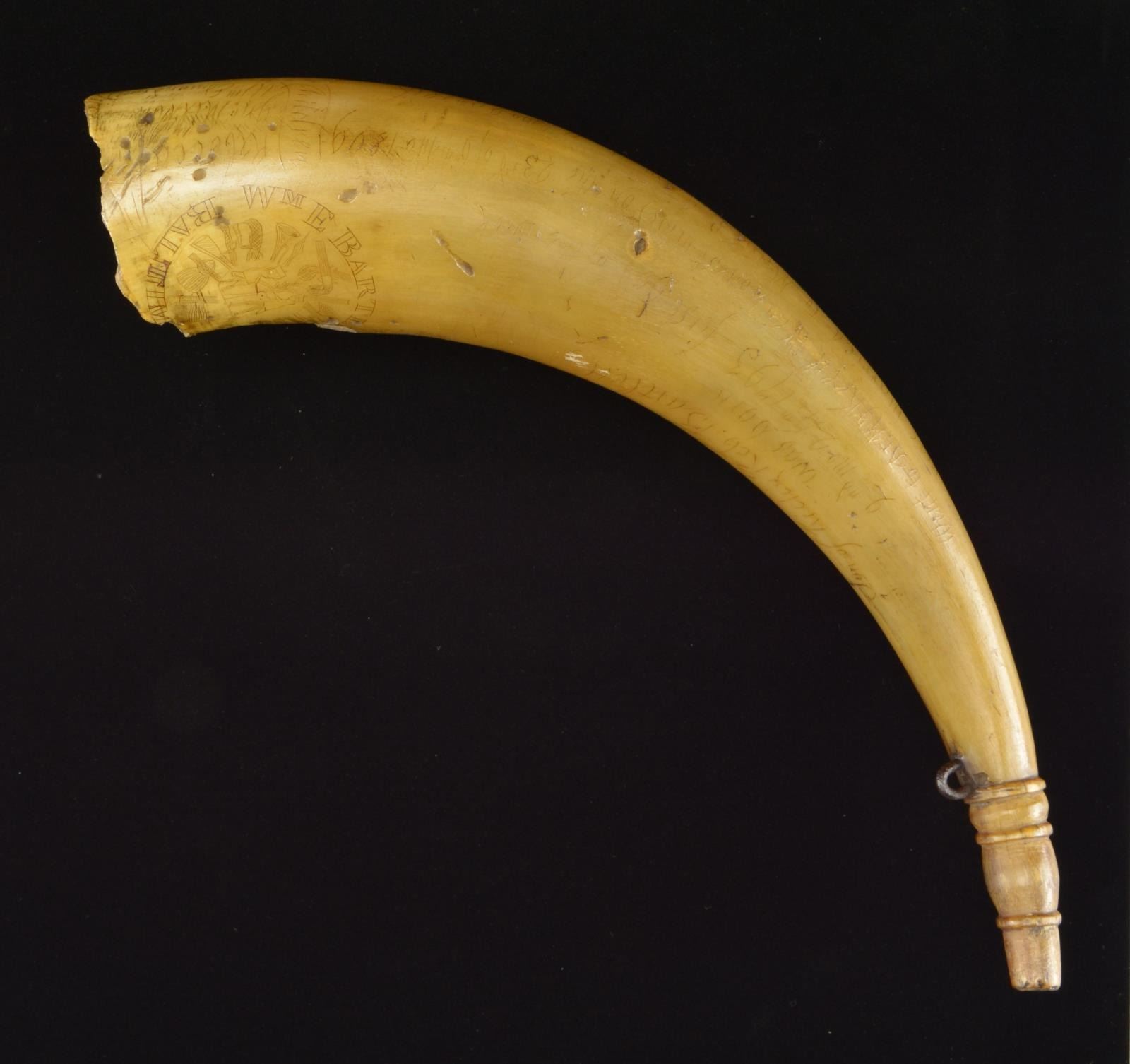 HORN. Horn measures approx. 13 1/8" in length. This horn was engraved in 2 periods. It was engraved during the War of 1812 w/ exemplary circular engravings followed by a subsequent engraving likely by a relative in 1844. The initial carving consists of 3 distinct circular engravings. 1 Carving has a central American eagle w/ a ribbon in his beak that reads, “E PLURIBUS UNUM”. Encircling the eagle are the words, “WHERE LIBERTY DWELLS THERE IS M(Y) (C)OUNTRY”. The second carving has a central clock w/ Roman numerals w/ the hands at 2 o’clock. Encircling the clock are the words, “WE MET THE ENEMY AND THEY ARE OU(RS) (O.H. P)ERRY”. These were the words uttered by Olive Hazard Perry after his famous War of 1812 Naval victory. The 2 o’clock time refers to when the battle was won. The third carving has 2 blacksmiths surrounded by swords, axes, pistols, guns & other implements of war. Encircling the blacksmiths & arms are the words, “WM E BARTLE(TT) BALTIM(ORE MD)”. The later carving was probably added by a relative to commemorate the death of William Bartlett in 1844. The carving is a bit difficult to interpret but appears to read, “Son of Riclcy Reb. Bartlett was born 2nd Mo 24th 1793 first day of week. Went to Dr. H Keld (an honest man) on the 23rd of 6th Mo 1809 was married to Mary L James 11th Mo 20th 1816 [image of goose] 11th mo. 20th 1816 1 mo. 13th 1844 our children Rebecca Jne. Milton Wm. Edmundson Mary. Rich.”. The spout of the horn has turned decoration & just below the spout is an iron loop. CONDITION: the horn body remains solid & the engraving is surprisingly clear & legible. However, the wood plug is gone & there are significant losses to the butt end of the horn affecting some of the circular engravings. Despite the damage, an exceptionally interesting & well engraved horn w/ fascinating folky additions. (02-14966/BF). $500-800.