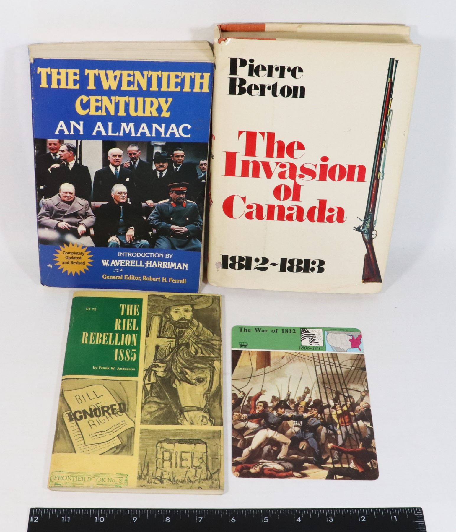 HARDCOVER BOOK AND THE TWENTIETH CENTURY AND ALMANAC, THE RIEL REBELLION 1885 WITH VINTAGE COLORED INFO CARD