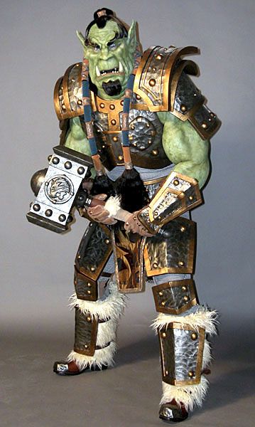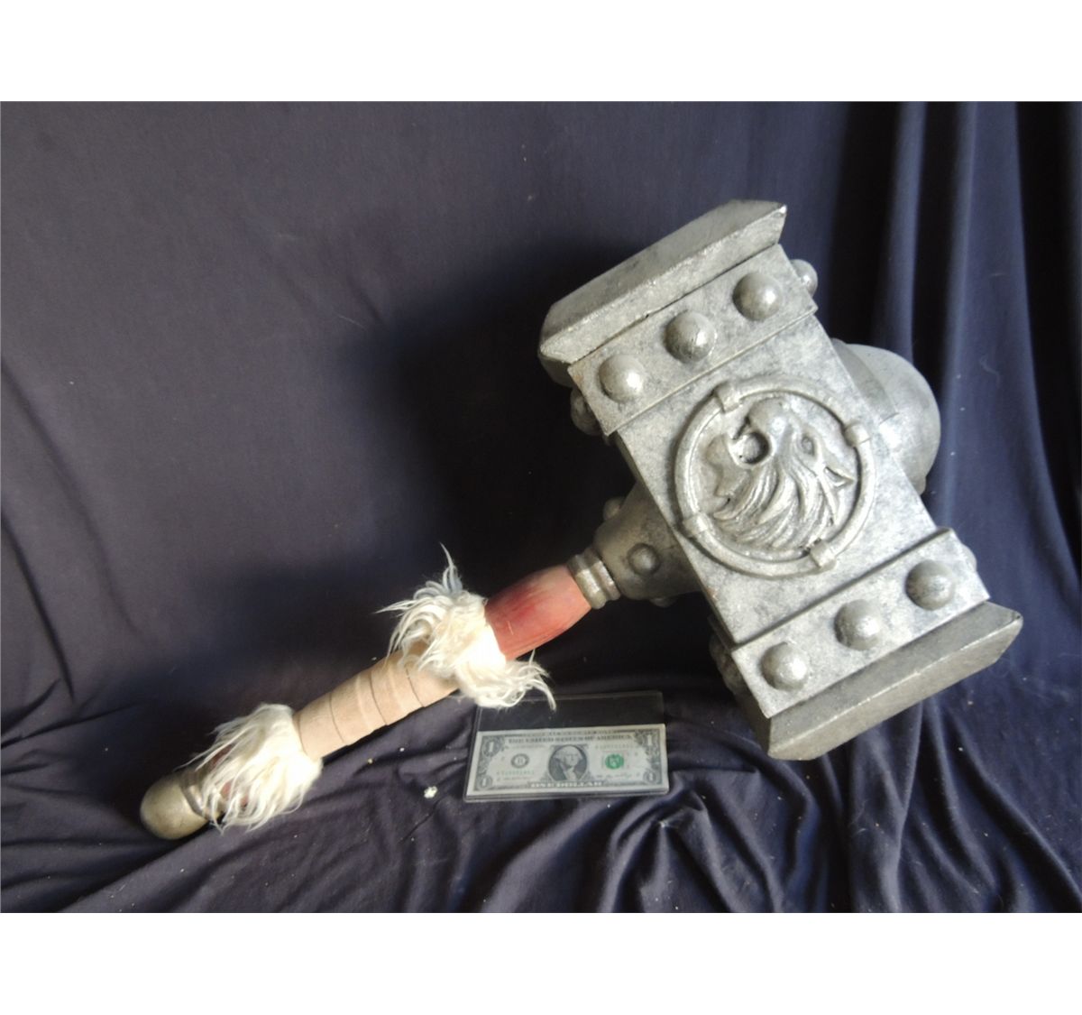 This is Thrall's hammer, an absolutely incredible piece of video. It is a hand fabricated prop created by Ken Hall of Total Fabrication for one of seven intricate costumes used to promote Blizzard's Warcraft III game. The head is foam-fabricated with cast detail. The handle is solid wood with faux fur and leather.