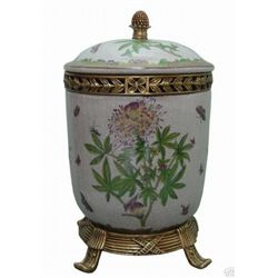 FINE PORCELAIN LIDDED JAR - HAND PAINTED FLORAL, BUTTERFLY AND BIRD DESIGN - CRACKLED FINISH - ORNATE CARVED BRASS TRIM HANDLES AND BASE - 9W"...