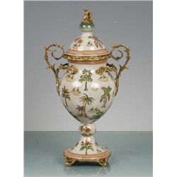 PORCELAIN LIDDED VASE - HAND PAINTED PALM TREES AND DESIGNS - BRASS ACCENTS -11.9L" x7.8W"x 20.9H"