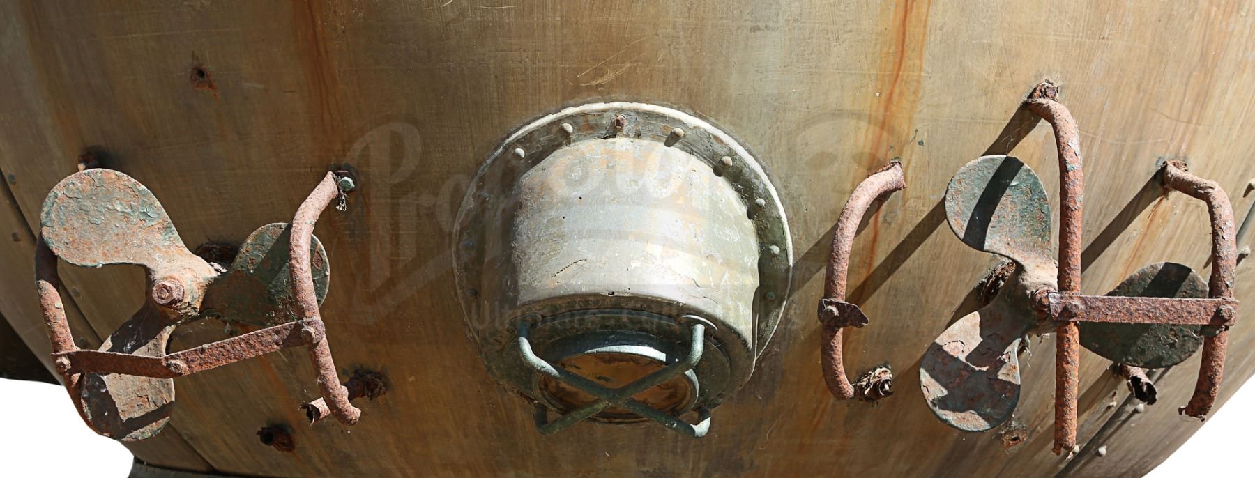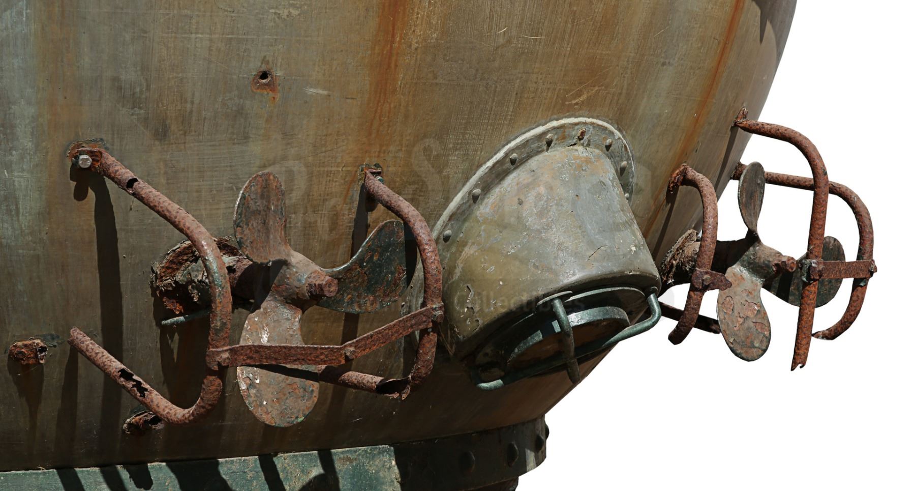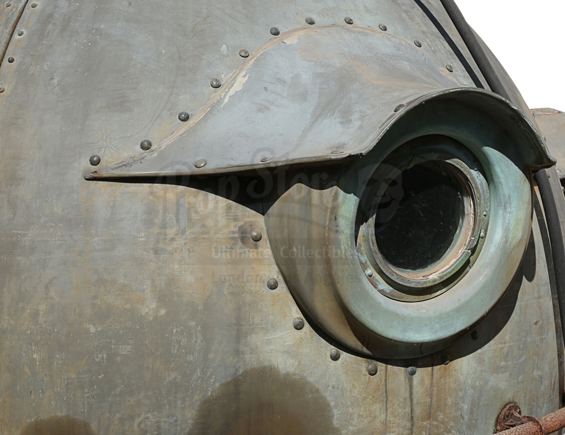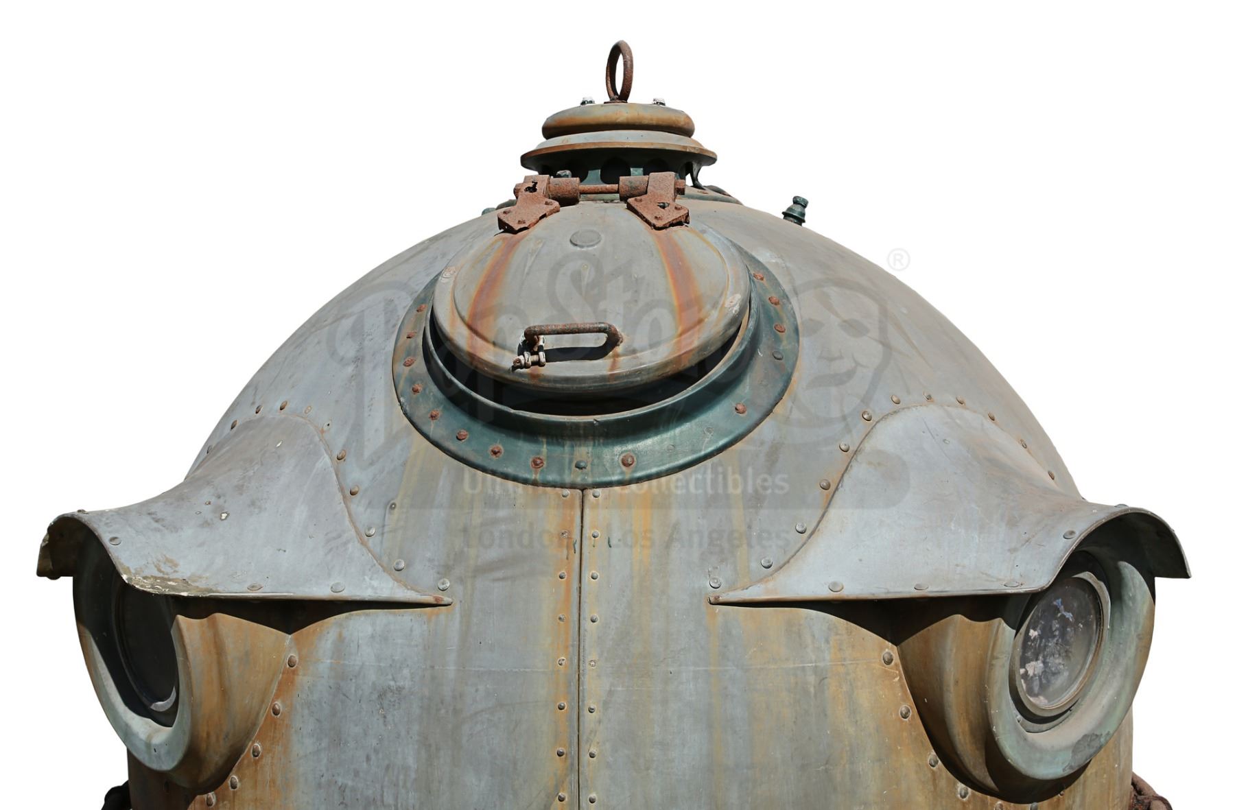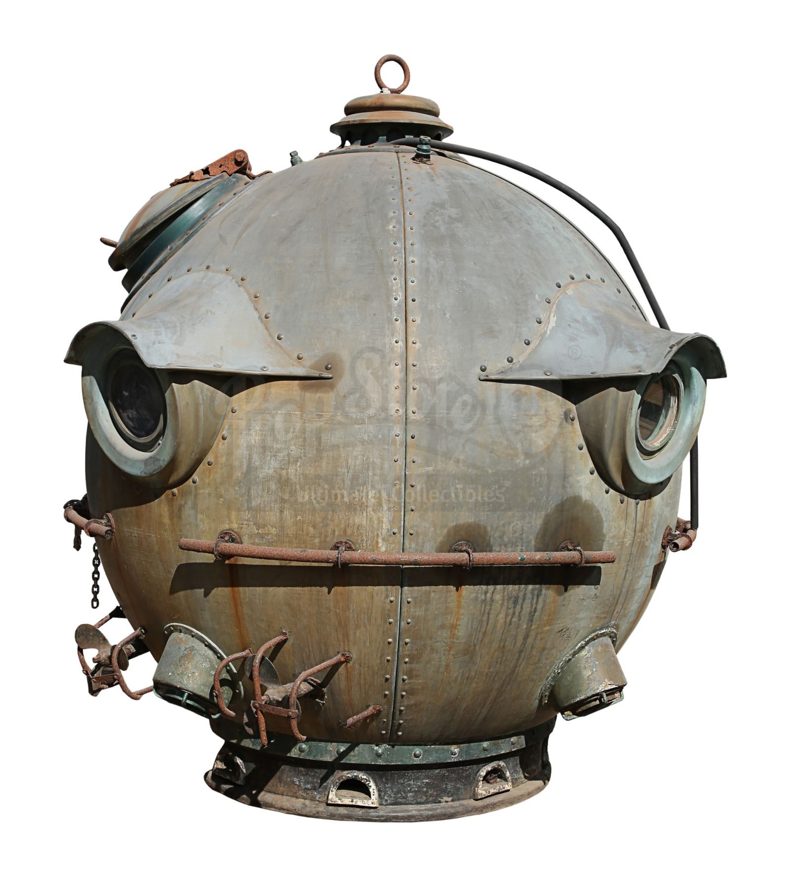 This giant prop, designed in a 19th Century, Jules Verne-esque style, bears a plaque which reads, "The Aitken Submersible Observatory, Boston 1896". It is fabricated from fibreglass over a steel structure. It features a moving hatch on the top and windows dotted around its edge, and is dressed with fake rivets. The paintwork on the vessel is a green-copper colour (verdigris), and the metal pipework on the exterior is heavily rusted, but the piece remains in good overall condition. Dimensions: 240 cm x 240 cm x 275 cm (8' x 8' x 9')