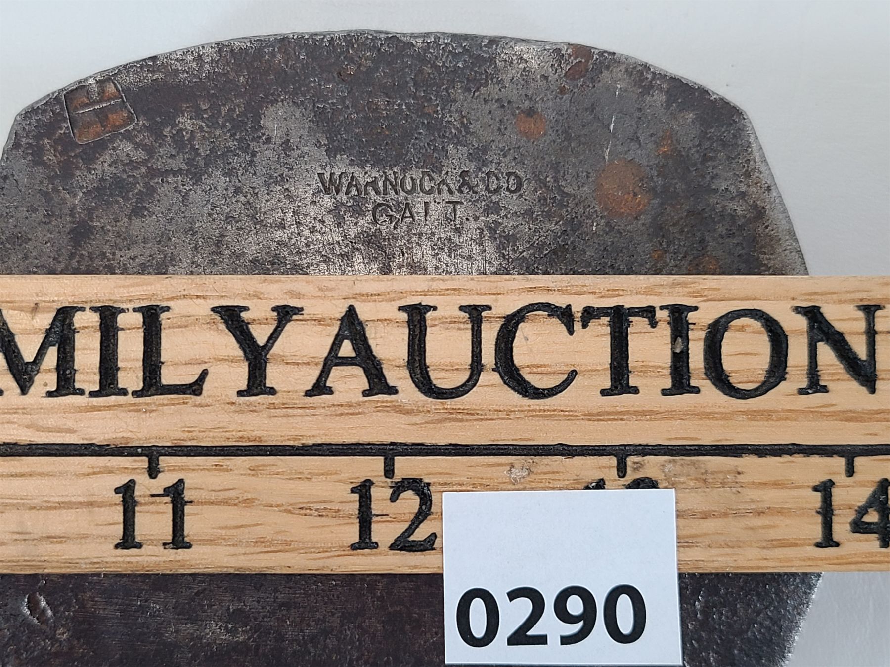 WARNOCK & CO WAS FOUNDED BY JAMES WARNOCK A SCOTTISH IMMIGRANT WHO CAME TO CANADA IN 1833 WITH HIS PARENTS AND SIBLING AND SETTLED IN GALT, ONTARIO. HE OWNED NUMEROUS BUSINESSES INCLUDING THE GALT EDGE TOOL CO., (ALSO CALLED THE GALT AXE CO.) AND THE GALT AXE FACTORY. IN 1860, WARNOCK BOUGHT A HARDWARE STORE WHERE HE SOLD THE PRODUCTS OF VARIOUS MANUFACURERS. IN 1870, WARNOCK TOOK OVER THE GALT AXE FACTORY, GALT EDGE TOOL AND CARRIAGE SPRING WORKS. THE BUSINESSES WERE ALL RENAMED JAMES WARNOCK & CO. THE DISPARITY IN NAMES CAUSED SOME CONFUSION, BUT IT ALLOWED THE COMPANY TO DIVERSIFY. MANY OF THE AXES MARKETED AT THAT TIME WERE MARKED J. WARNOCK & CO BY 1902, POSSIBLY EARLIER. OWN THIS UNIQUE PIECE OF CANADIAN HISTORY - PRIVATE COLLECTIONS AND MUSEUMS ALIKE WILL WANT THIS REMINDER OF ONTARIO’S RICH HISTORY