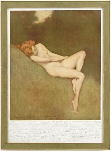 WARREN B. DAVIS (American, 1865-1928) SALMAGUNDI CLUB SIGNED PRESENTATION PRINT. This framed print of a nude woman on hillside (Spirit of Dreams) is pencil inscribed ""To Walter Ufer from Samuel T. Shaw Salmagundi Club 1929in.. In the bottom white margin ""In Memory of Warren B. Davis"" under which is signed by approximately fifty different artists in pencil. They include: Walter Ufer, Gordon Grant, Edmund Greacen, J.E. Costigan, Guy Wiggins and many others. An interesting piece of Salmagundi Club history. On the back is a label from De La Pena Books Santa Fe, New Mexico ""Presented to Bart Durham April 6, 1981 as a Memento of the Personnel Papers of Walter Ufer, Bought by Steve Good for Rosenstock Arts, Denver, Colorado. Discovered by Bart in the attic of the Rackleys at Sapallo, New Mexico"". Found locally in central Maine. SIGHT SIZE: 22-1/2in. x 15-3/4in.. CONDITION: Very good. 9-26377