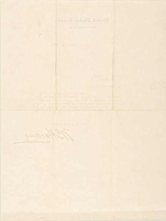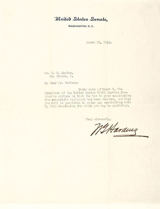 March 13, 1916-Dated, Typed Letter Signed, “W. G. Harding” on United States Senate Official Letterhead, measuring 10.5” x 8,” 1 page, Washington, DC, Choice Very Fine+. Harding writes to W. W. Eccles regarding a government exam. It reads, in part, “Under date of March 8, the President of the United States Civil Service Commission advises me that the bar to your examination for scientific assistant has been removed, and that you will be permitted to enter any examination held by this Commission for which you may be qualified.” This cataloger has never seen a nicer, bolder Harding signature as with this 2.25” long vivid brown example upon “Crane’s 1914 - ALL LINEN” watermarked paper.
